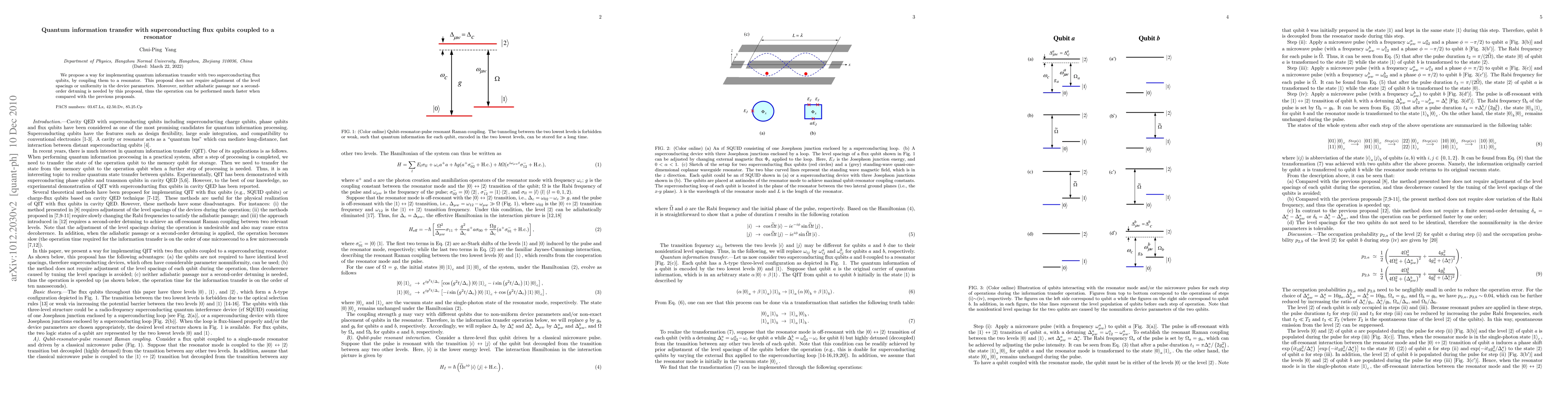 Summary: This paper proposes a method for quantum information transfer using superconducting flux qubits coupled to a resonator, which does not require precise adjustments or specific detunings, allowing for faster operation compared to previous methods.
