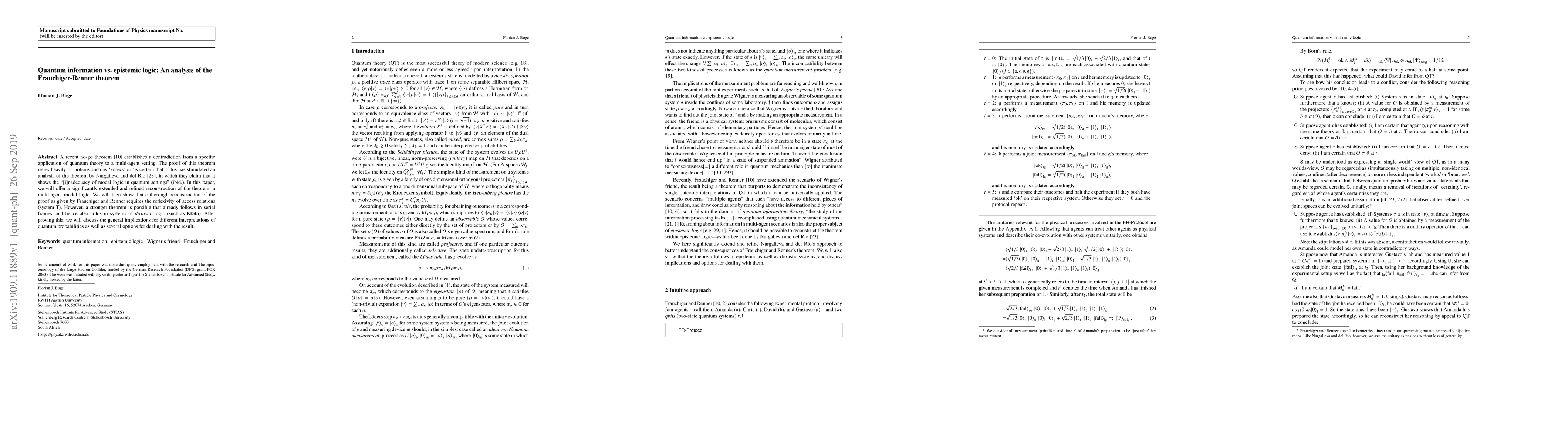 A recent no-go theorem (Frauchiger and Renner, 2018) establishes a contradiction from a specific application of quantum theory to a multi-agent setting. The proof of this theorem relies heavily on notions such as 'knows' or `is certain that'. This has stimulated an analysis of the theorem by Nurgalieva and del Rio (2018), in which they claim that it shows the "[i]nadequacy of modal logic in quantum settings" (ibid.). In this paper, we will offer a significantly extended and refined reconstruction of the theorem in multi-agent modal logic. We will then show that a thorough reconstruction of the proof as given by Frauchiger and Renner requires the reflexivity of access relations (system $\mathsf{\mathbf{T}}$). However, a stronger theorem is possible that already follows in serial frames, and hence also holds in systems of \emph{doxastic} logic (such as $\mathsf{\mathbf{KD45}}$). After proving this, we will discuss the general implications for different interpretations of quantum probabilities as well as several options for dealing with the result.
