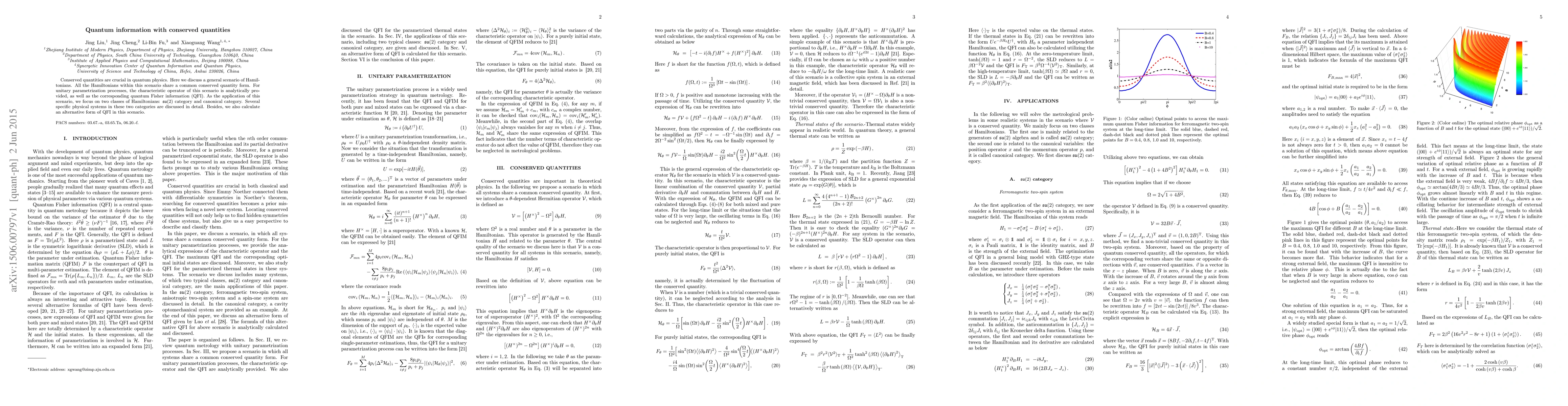 Conserved quantities are crucial in quantum physics. Here we discuss a general scenario of Hamiltonians. All the Hamiltonians within this scenario share a common conserved quantity form. For unitary parametrization processes, the characteristic operator of this scenario is analytically provided, as well as the corresponding quantum Fisher information (QFI). As the application of this scenario, we focus on two classes of Hamiltonians: su(2) category and canonical category. Several specific physical systems in these two categories are discussed in detail. Besides, we also calculate an alternative form of QFI in this scenario.