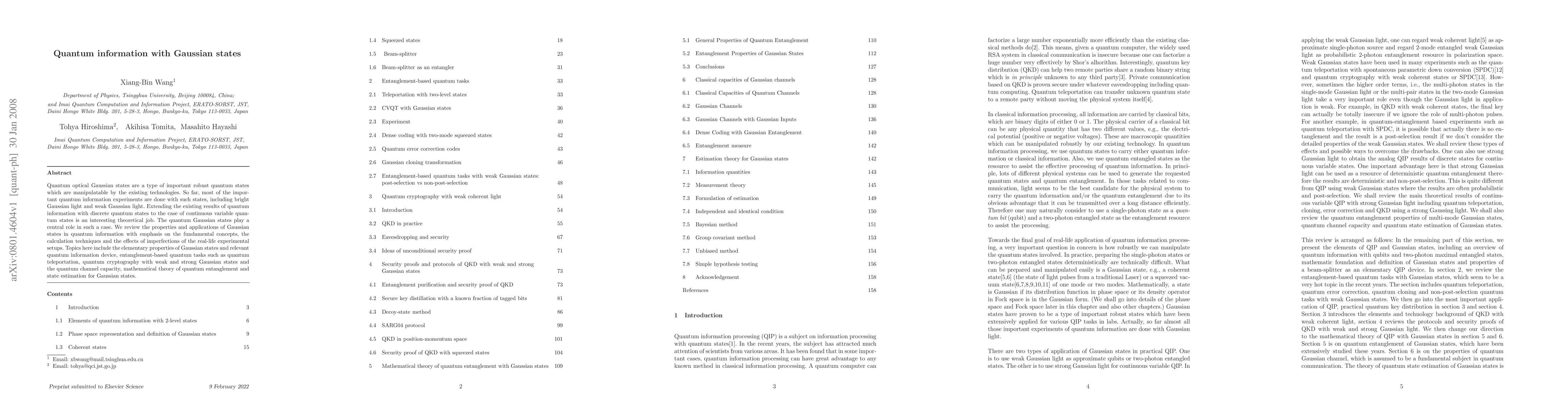 Quantum optical Gaussian states are a type of important robust quantum states which are manipulatable by the existing technologies. So far, most of the important quantum information experiments are done with such states, including bright Gaussian light and weak Gaussian light. Extending the existing results of quantum information with discrete quantum states to the case of continuous variable quantum states is an interesting theoretical job. The quantum Gaussian states play a central role in such a case. We review the properties and applications of Gaussian states in quantum information with emphasis on the fundamental concepts, the calculation techniques and the effects of imperfections of the real-life experimental setups. Topics here include the elementary properties of Gaussian states and relevant quantum information device, entanglement-based quantum tasks such as quantum teleportation, quantum cryptography with weak and strong Gaussian states and the quantum channel capacity, mathematical theory of quantum entanglement and state estimation for Gaussian states.