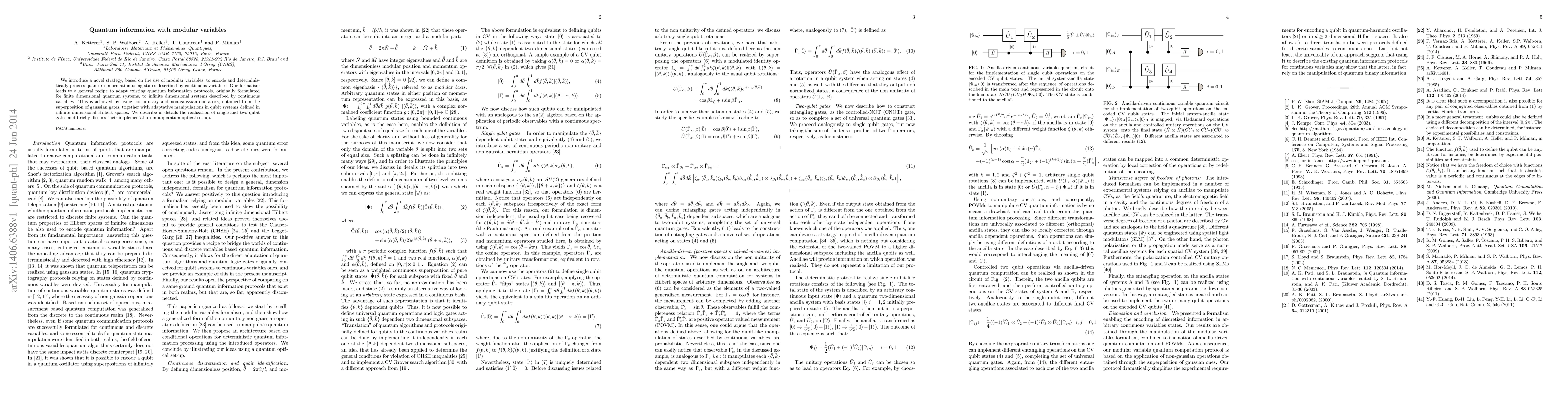 This paper proposes a new method for encoding and processing quantum information using modular variables and continuous variable states, adapting existing protocols for finite systems to infinite dimensions. It details the use of non-Gaussian operators and adaptive qubit manipulations, and outlines the implementation of single and two qubit gates in a quantum optical setup.