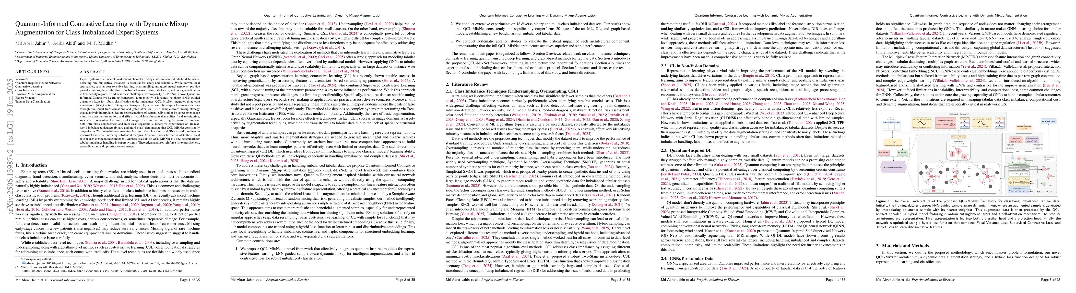 The research proposes QCL-MixNet, a novel Quantum-Informed Contrastive Learning framework with dynamic mixup augmentation for class-imbalanced expert systems, integrating quantum entanglement-inspired layers, adaptive mixup strategy, and a hybrid loss function.