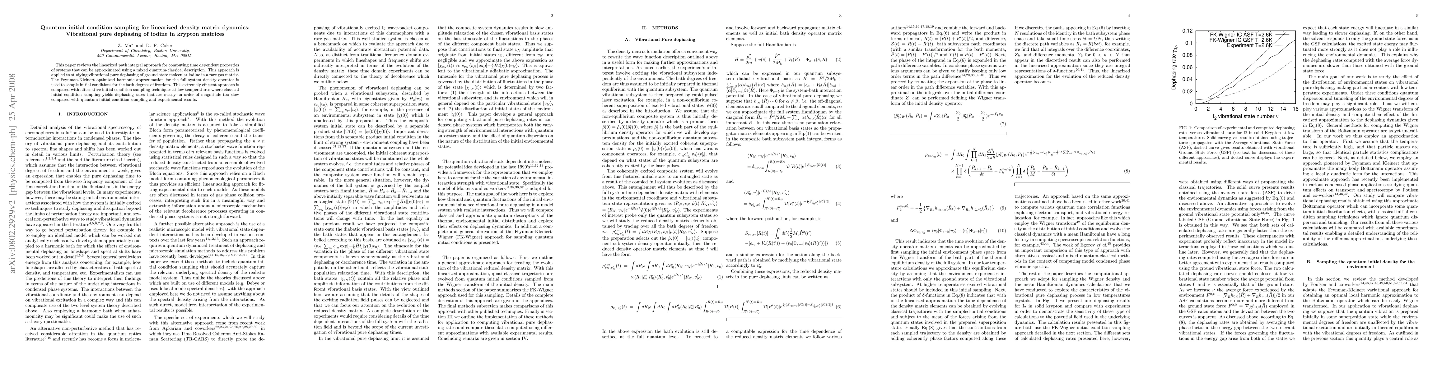 This paper reviews the linearized path integral approach for computing time dependent properties of systems that can be approximated using a mixed quantum-classical description. This approach is applied to studying vibrational pure dephasing of ground state molecular iodine in a rare gas matrix. The Feynman-Kleinert optimized harmonic approximation for the full system density operator is used to sample initial conditions for the bath degrees of freedom. This extremely efficient approach is compared with alternative initial condition sampling techniques at low temperatures where classical initial condition sampling yields dephasing rates that are nearly an order of magnitude too slow compared with quantum initial condition sampling and experimental results.