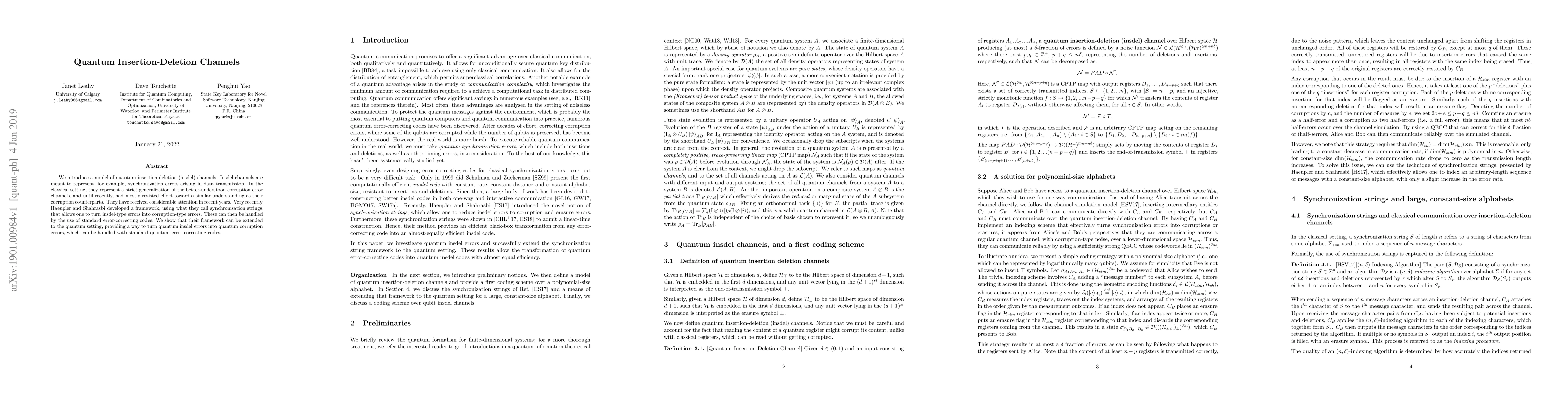 We introduce a model of quantum insertion-deletion (insdel) channels. Insdel channels are meant to represent, for example, synchronization errors arising in data transmission. In the classical setting, they represent a strict generalization of the better-understood corruption error channels, and until recently, had mostly resisted effort toward a similar understanding as their corruption counterparts. They have received considerable attention in recent years. Very recently, Haeupler and Shahrasbi developed a framework, using what they call synchronisation strings, that allows one to turn insdel-type errors into corruption-type errors. These can then be handled by the use of standard error-correcting codes. We show that their framework can be extended to the quantum setting, providing a way to turn quantum insdel errors into quantum corruption errors, which can be handled with standard quantum error-correcting codes.