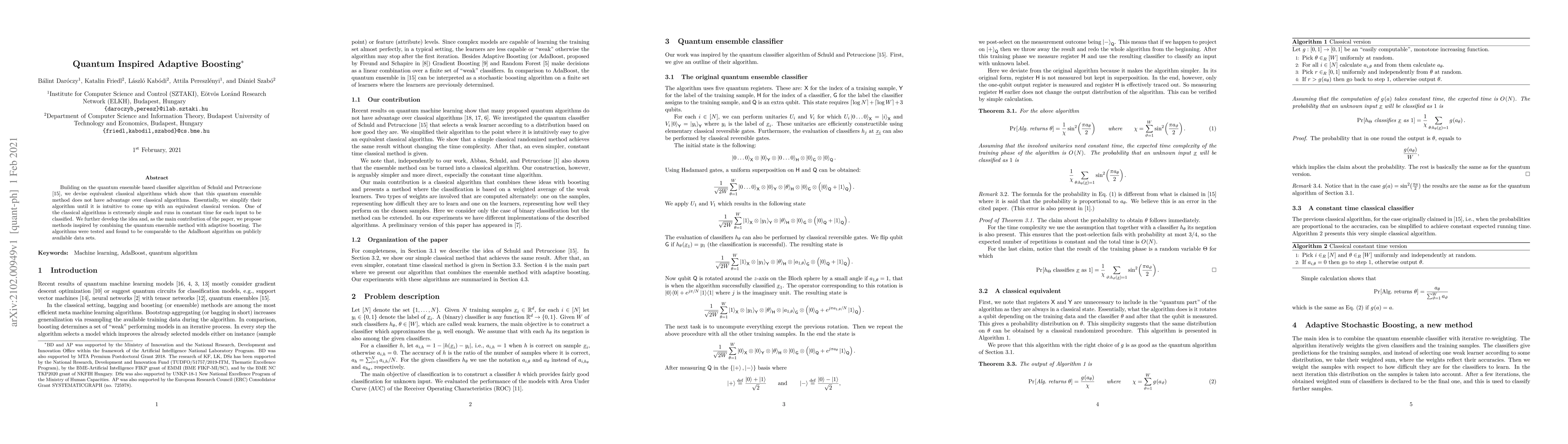 This paper explores classical equivalents of a quantum ensemble classifier, demonstrating no quantum advantage. It proposes adaptive boosting methods inspired by the quantum approach, which were found comparable to AdaBoost on standard datasets.