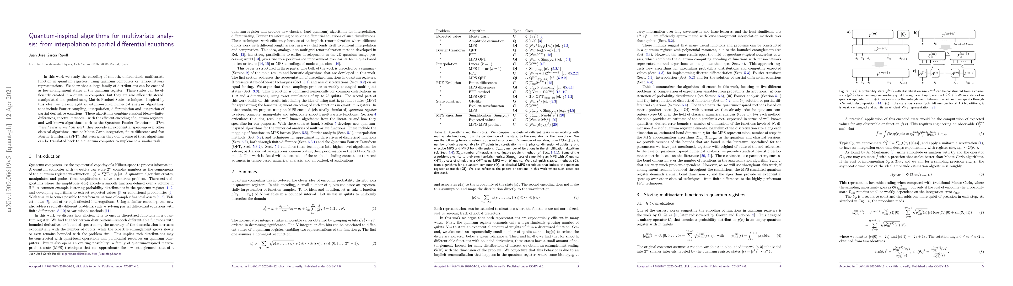 In this work we study the encoding of smooth, differentiable multivariate functions in quantum registers, using quantum computers or tensor-network representations. We show that a large family of distributions can be encoded as low-entanglement states of the quantum register. These states can be efficiently created in a quantum computer, but they are also efficiently stored, manipulated and probed using Matrix-Product States techniques. Inspired by this idea, we present eight quantum-inspired numerical analysis algorithms, that include Fourier sampling, interpolation, differentiation and integration of partial derivative equations. These algorithms combine classical ideas -- finite-differences, spectral methods -- with the efficient encoding of quantum registers, and well known algorithms, such as the Quantum Fourier Transform. {When these heuristic methods work}, they provide an exponential speed-up over other classical algorithms, such as Monte Carlo integration, finite-difference and fast Fourier transforms (FFT). But even when they don't, some of these algorithms can be translated back to a quantum computer to implement a similar task.