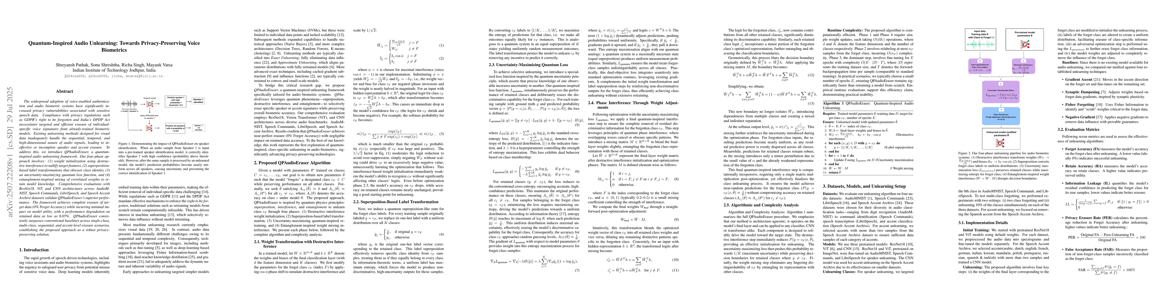 The widespread adoption of voice-enabled authentication and audio biometric systems have significantly increased privacy vulnerabilities associated with sensitive speech data. Compliance with privacy regulations such as GDPR's right to be forgotten and India's DPDP Act necessitates targeted and efficient erasure of individual-specific voice signatures from already-trained biometric models. Existing unlearning methods designed for visual data inadequately handle the sequential, temporal, and high-dimensional nature of audio signals, leading to ineffective or incomplete speaker and accent erasure. To address this, we introduce QPAudioEraser, a quantum-inspired audio unlearning framework. Our our-phase approach involves: (1) weight initialization using destructive interference to nullify target features, (2) superposition-based label transformations that obscure class identity, (3) an uncertainty-maximizing quantum loss function, and (4) entanglement-inspired mixing of correlated weights to retain model knowledge. Comprehensive evaluations with ResNet18, ViT, and CNN architectures across AudioMNIST, Speech Commands, LibriSpeech, and Speech Accent Archive datasets validate QPAudioEraser's superior performance. The framework achieves complete erasure of target data (0% Forget Accuracy) while incurring minimal impact on model utility, with a performance degradation on retained data as low as 0.05%. QPAudioEraser consistently surpasses conventional baselines across single-class, multi-class, sequential, and accent-level erasure scenarios, establishing the proposed approach as a robust privacy-preserving solution.