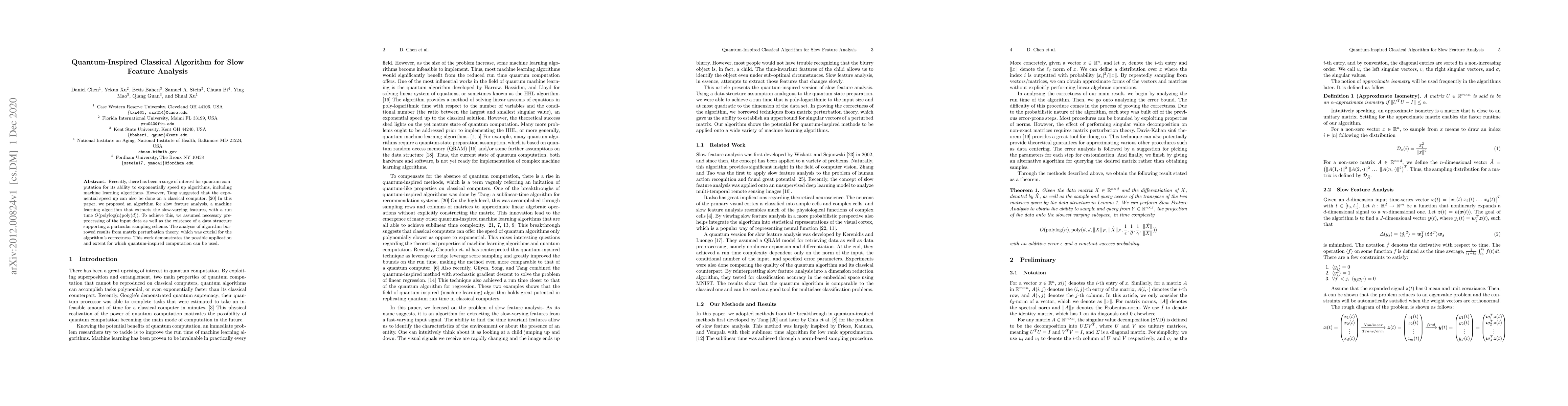 This paper proposes a classical algorithm inspired by quantum computation for slow feature analysis, achieving a runtime of O(polylog(n)poly(d)). The algorithm leverages matrix perturbation theory and assumes specific data preprocessing and sampling schemes, showcasing the potential for quantum-inspired techniques in classical computing.