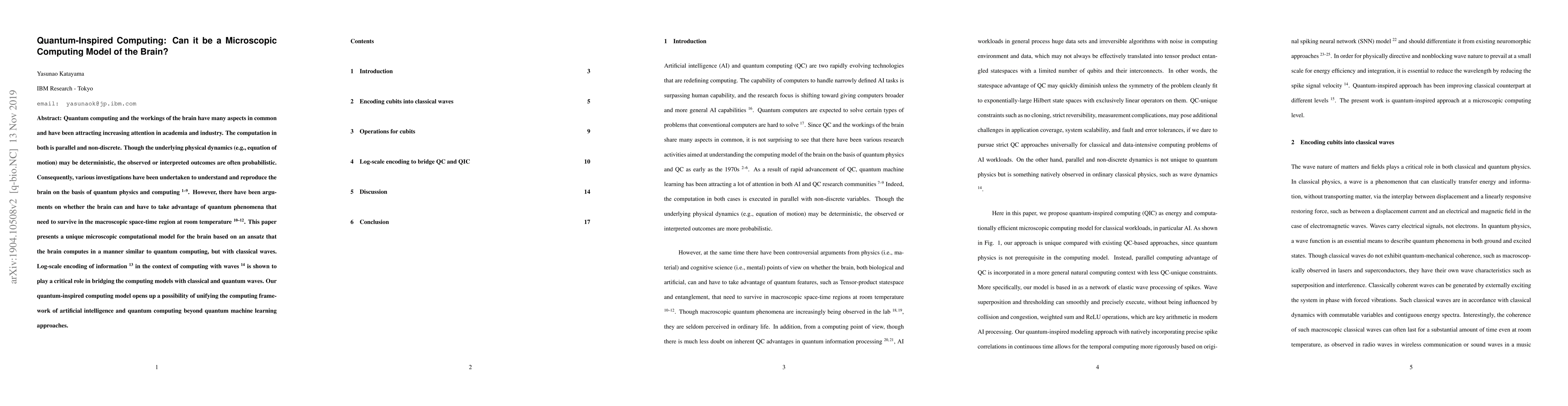Quantum computing and the workings of the brain have many aspects in common and have been attracting increasing attention in academia and industry. The computation in both is parallel and non-discrete. Though the underlying physical dynamics (e.g., equation of motion) may be deterministic, the observed or interpreted outcomes are often probabilistic. Consequently, various investigations have been undertaken to understand and reproduce the brain on the basis of quantum physics and computing. However, there have been arguments on whether the brain can and have to take advantage of quantum phenomena that need to survive in the macroscopic space-time region at room temperature. This paper presents a unique microscopic computational model for the brain based on an ansatz that the brain computes in a manner similar to quantum computing, but with classical waves. Log-scale encoding of information in the context of computing with waves is shown to play a critical role in bridging the computing models with classical and quantum waves. Our quantum-inspired computing model opens up a possibility of unifying the computing framework of artificial intelligence and quantum computing beyond quantum machine learning approaches.
