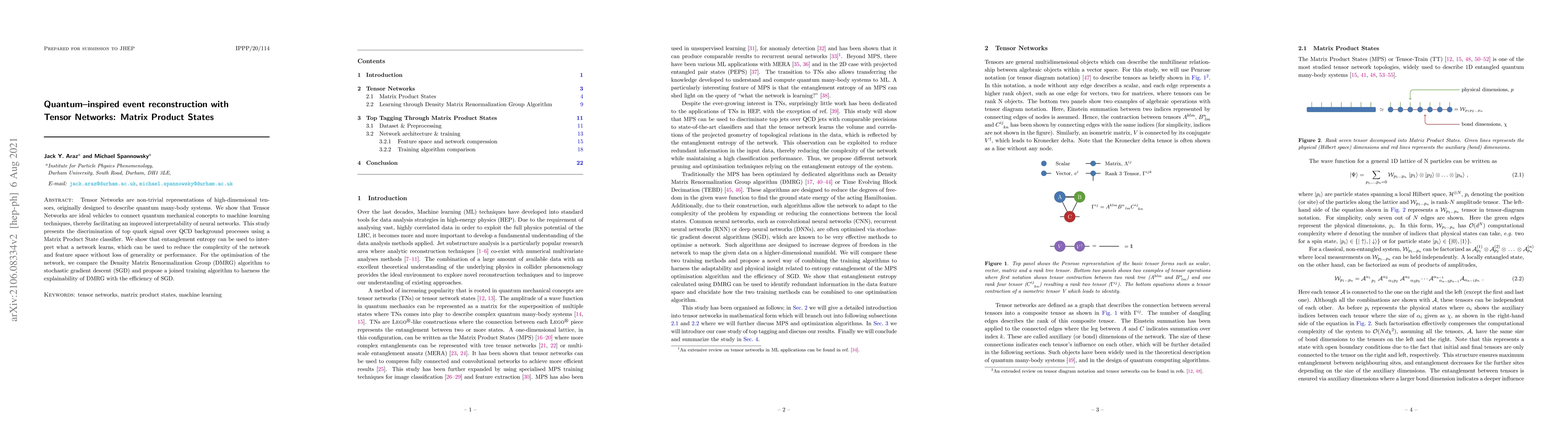 This paper explores using Tensor Networks, specifically Matrix Product States, to enhance event reconstruction in high-energy physics, demonstrating their effectiveness in distinguishing top quark signals from QCD backgrounds. It leverages entanglement entropy for interpretability and proposes a hybrid training algorithm combining DMRG and SGD for optimization.