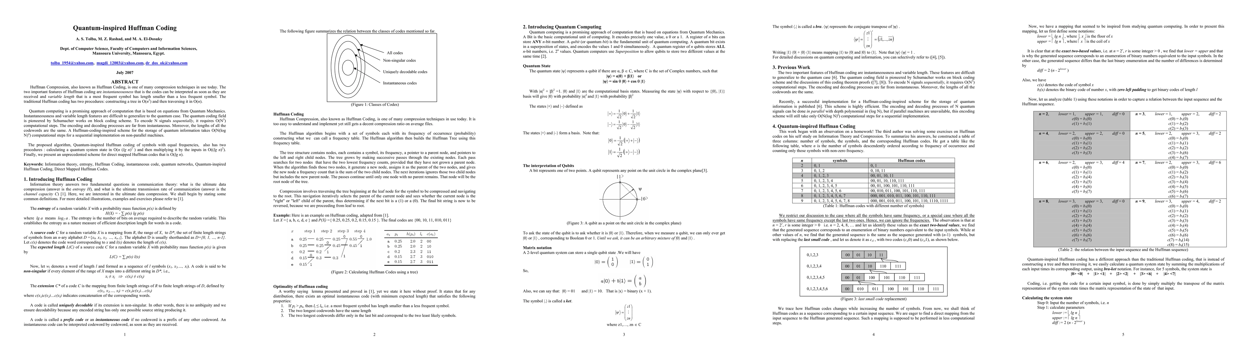 Huffman Compression, also known as Huffman Coding, is one of many compression techniques in use today. The two important features of Huffman coding are instantaneousness that is the codes can be interpreted as soon as they are received and variable length that is a most frequent symbol has length smaller than a less frequent symbol. The traditional Huffman coding has two procedures: constructing a tree in O(n^2) and then traversing it in O(n). Quantum computing is a promising approach of computation that is based on equations from Quantum Mechanics. Instantaneousness and variable length features are difficult to generalize to the quantum case. The quantum coding field is pioneered by Schumacher works on block coding scheme. To encode N signals sequentially, it requires O(N3) computational steps. The encoding and decoding processes are far from instantaneous. Moreover, the lengths of all the codewords are the same. A Huffman-coding-inspired scheme for the storage of quantum information takes O(N(log N)a) computational steps for a sequential implementation on non-parallel machines.