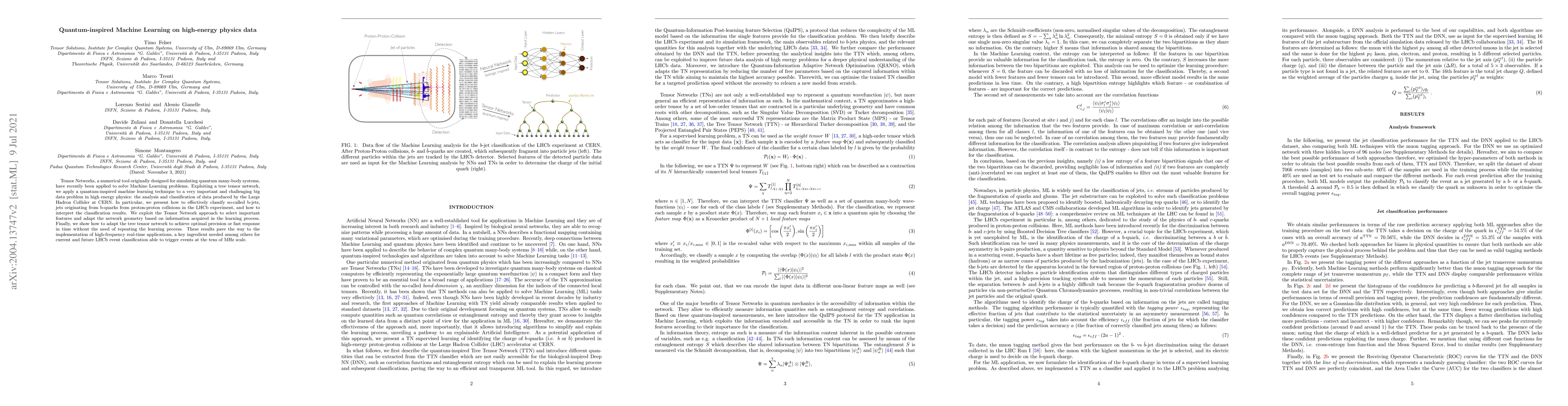 This paper explores using tensor networks—originally developed for quantum many-body systems—for machine learning tasks in high-energy physics, focusing on classifying b-jets from LHCb data. It demonstrates how to effectively adapt the tensor network geometry for optimal precision or speed without retraining.