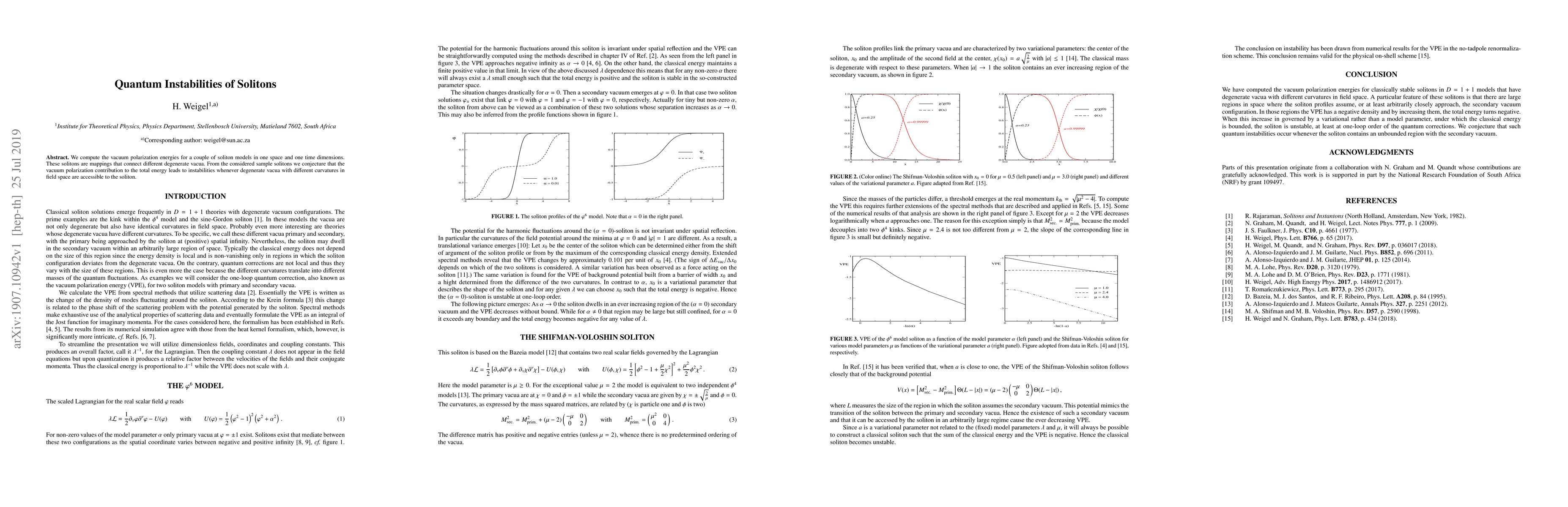 This study calculates quantum energy effects on certain one-dimensional solitons and suggests that these quantum corrections can cause instabilities when the solitons connect different vacua with varying properties. The findings highlight how quantum fluctuations influence the stability of these field configurations.