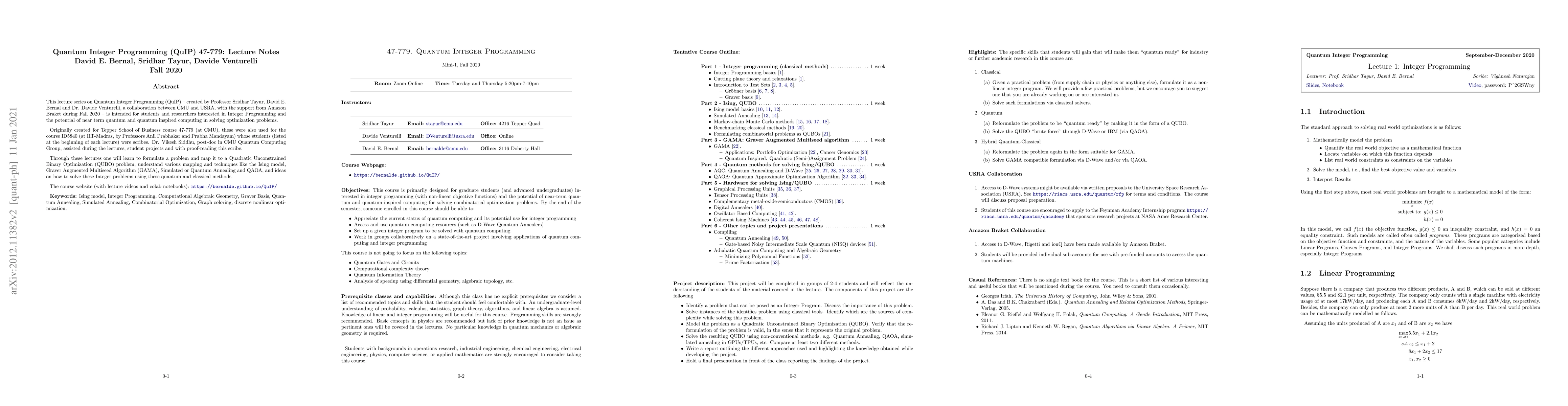 This lecture series on Quantum Integer Programming (QuIP) -- created by Professor Sridhar Tayur, David E. Bernal, and Dr. Davide Venturelli, a collaboration between CMU and USRA, with the support from Amazon Braket during Fall 2020 -- is intended for students and researchers interested in Integer Programming and the potential of near term quantum and quantum-inspired computing in solving optimization problems. Originally created for Tepper School of Business course 47-779 (at CMU), these were also used for the course ID5840 (at IIT-Madras, by Professors Anil Prabhakar and Prabha Mandayam) whose students (listed at the beginning of each lecture) were scribes. Dr. Vikesh Siddhu, post-doc in CMU Quantum Computing Group, assisted during the lectures, student projects, and with proof-reading this scribe. Through these lectures one will learn to formulate a problem and map it to a Quadratic Unconstrained Binary Optimization (QUBO) problem, understand various mapping and techniques like the Ising model, Graver Augmented Multiseed Algorithm (GAMA), Simulated or Quantum Annealing and QAOA, and ideas on how to solve these Integer problems using these quantum and classical methods.
