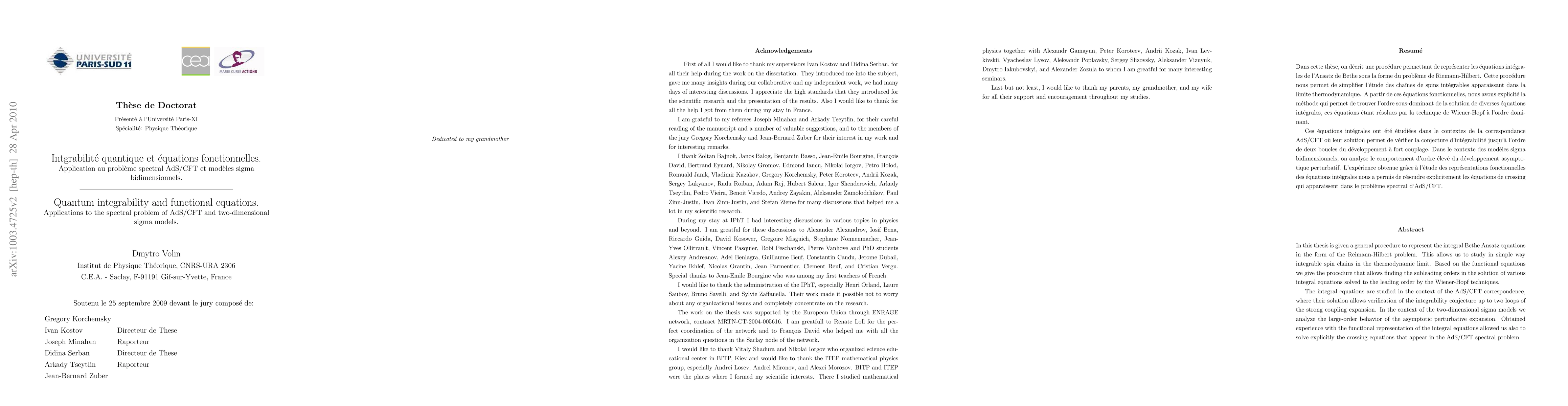 In this thesis a general procedure to represent the integral Bethe Ansatz equations in the form of the Reimann-Hilbert problem is given. This allows us to study in simple way integrable spin chains in the thermodynamic limit. Based on the functional equations we give the procedure that allows finding the subleading orders in the solution of various integral equations solved to the leading order by the Wiener-Hopf technics. The integral equations are studied in the context of the AdS/CFT correspondence, where their solution allows verification of the integrability conjecture up to two loops of the strong coupling expansion. In the context of the two-dimensional sigma models we analyze the large-order behavior of the asymptotic perturbative expansion. Obtained experience with the functional representation of the integral equations allowed us also to solve explicitly the crossing equations that appear in the AdS/CFT spectral problem.
