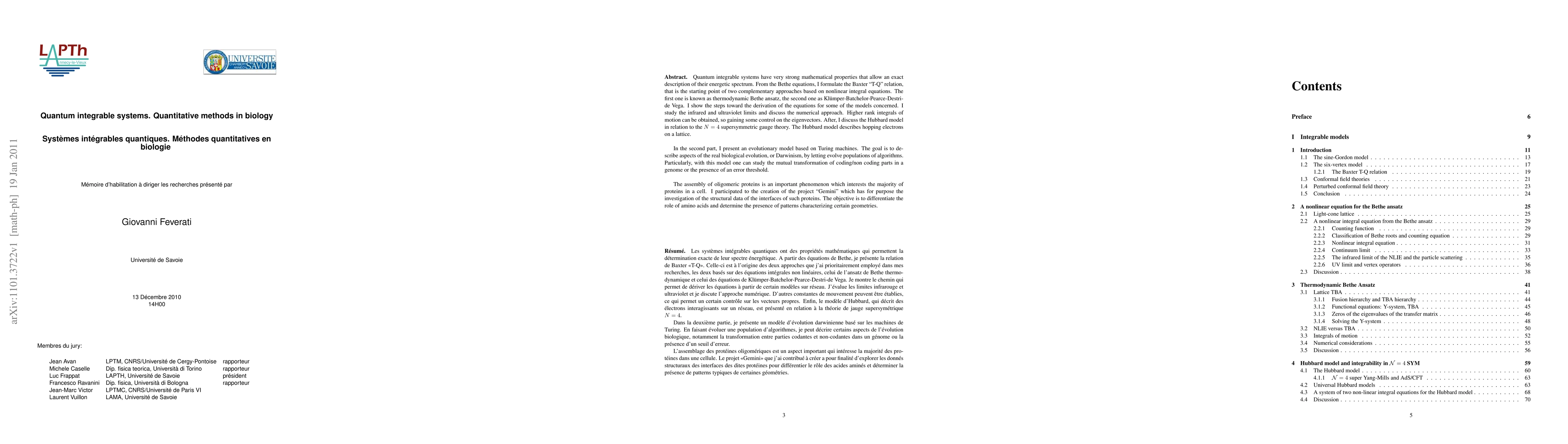 Quantum integrable systems have very strong mathematical properties that allow an exact description of their energetic spectrum. From the Bethe equations, I formulate the Baxter "T-Q" relation, that is the starting point of two complementary approaches based on nonlinear integral equations. The first one is known as thermodynamic Bethe ansatz, the second one as Kl\"umper-Batchelor-Pearce-Destri- de Vega. I show the steps toward the derivation of the equations for some of the models concerned. I study the infrared and ultraviolet limits and discuss the numerical approach. Higher rank integrals of motion can be obtained, so gaining some control on the eigenvectors. After, I discuss the Hubbard model in relation to the N = 4 supersymmetric gauge theory. The Hubbard model describes hopping electrons on a lattice. In the second part, I present an evolutionary model based on Turing machines. The goal is to describe aspects of the real biological evolution, or Darwinism, by letting evolve populations of algorithms. Particularly, with this model one can study the mutual transformation of coding/non coding parts in a genome or the presence of an error threshold. The assembly of oligomeric proteins is an important phenomenon which interests the majority of proteins in a cell. I participated to the creation of the project "Gemini" which has for purpose the investigation of the structural data of the interfaces of such proteins. The objective is to differentiate the role of amino acids and determine the presence of patterns characterizing certain geometries.