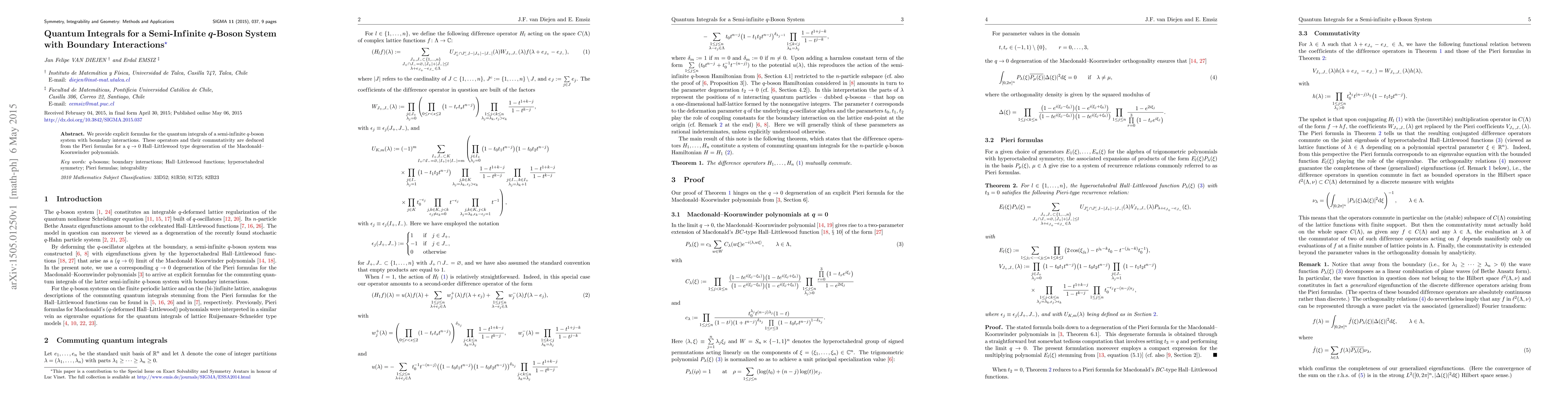 Summary: The paper derives explicit formulas for quantum integrals in a semi-infinite $q$-boson system with boundary interactions, establishing their commutativity through Pieri formulas linked to Hall-Littlewood type degenerations of Macdonald-Koornwinder polynomials.