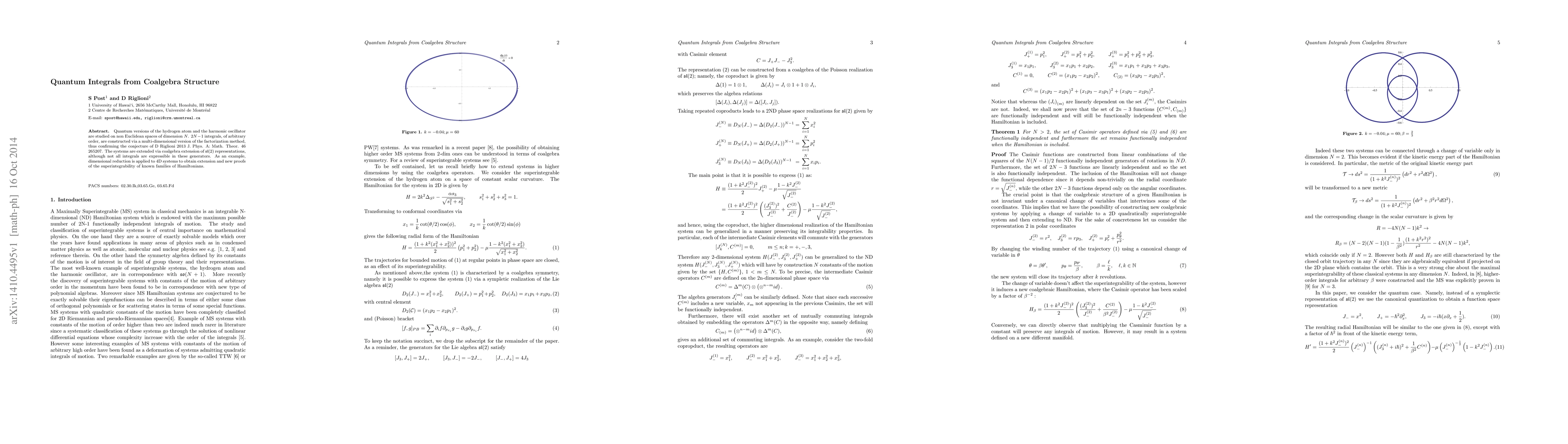 This paper constructs quantum integrals for the hydrogen atom and harmonic oscillator on non-Euclidean spaces using a multi-dimensional factorization method, confirming a 2013 conjecture. It extends these systems using coalgebra structures of sl(2) representations, demonstrating superintegrability through dimensional reduction.