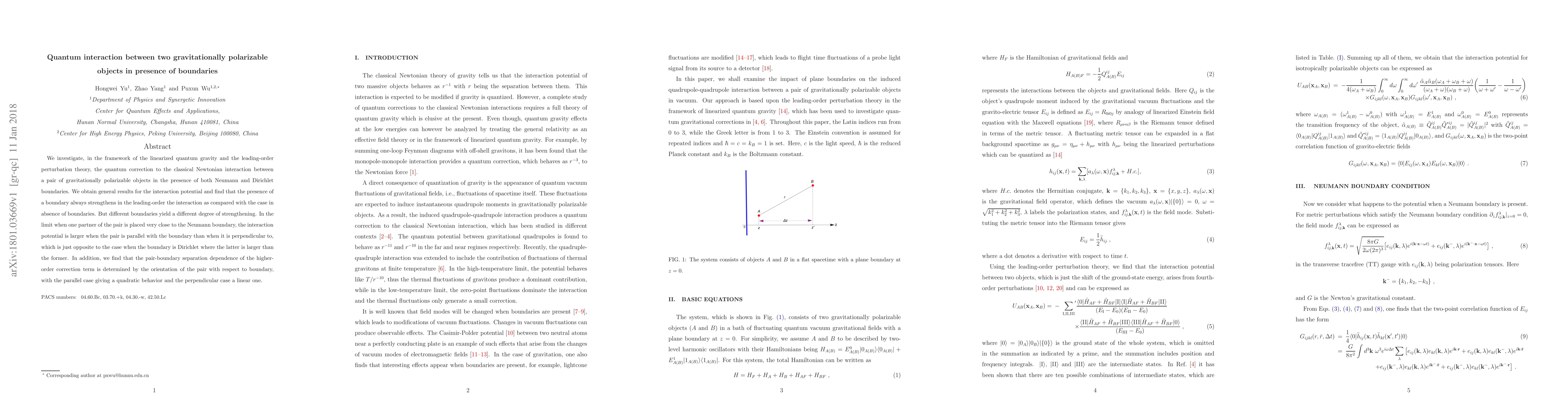 This paper explores quantum corrections to classical gravitational interaction between two polarizable objects in the presence of Neumann and Dirichlet boundaries, finding that boundaries generally enhance the interaction, with different boundary types yielding varying degrees of strengthening. The interaction's dependence on the pair's orientation relative to the boundary is also examined.