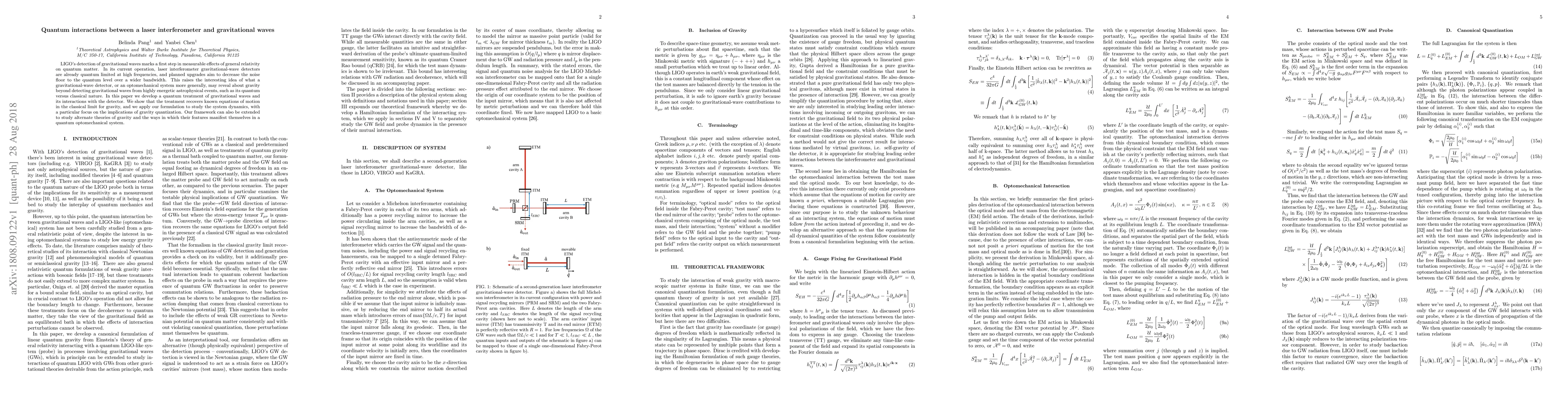LIGO's detection of gravitational waves marks a first step in measurable effects of general relativity on quantum matter. In its current operation, laser interferometer gravitational-wave detectors are already quantum limited at high frequencies, and planned upgrades aim to decrease the noise floor to the quantum level over a wider bandwidth. This raises the interesting idea of what a gravitational-wave detector, or an optomechanical system more generally, may reveal about gravity beyond detecting gravitational waves from highly energetic astrophysical events, such as its quantum versus classical nature. In this paper we develop a quantum treatment of gravitational waves and its interactions with the detector. We show that the treatment recovers known equations of motion in the classical limit for gravity, and we apply our formulation to study the system dynamics, with a particular focus on the implications of gravity quantization. Our framework can also be extended to study alternate theories of gravity and the ways in which their features manifest themselves in a quantum optomechanical system.