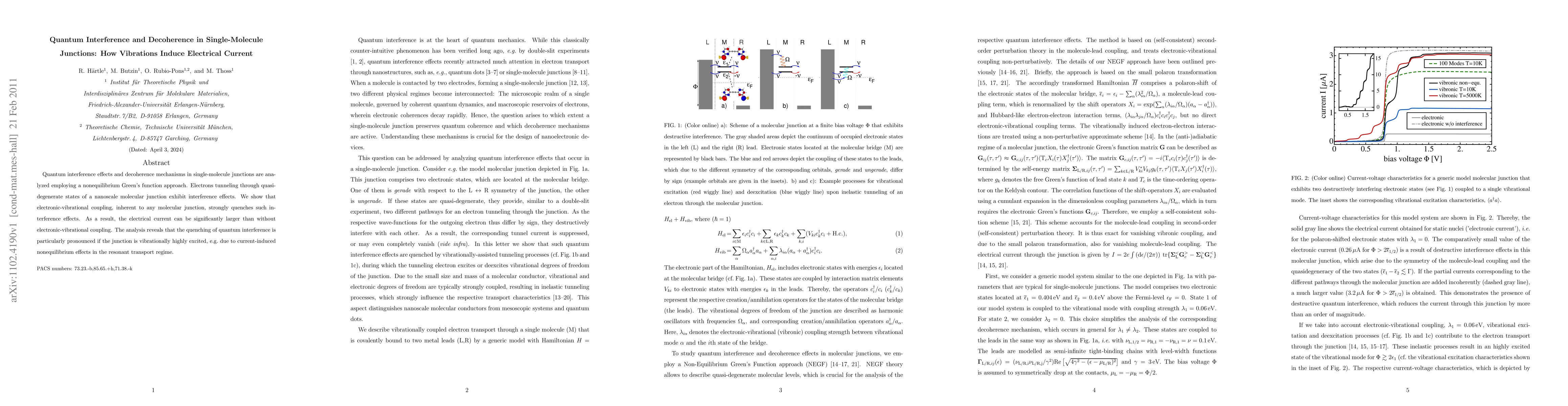 This study analyzes quantum interference and decoherence in single-molecule junctions using nonequilibrium Green's functions, revealing that electronic-vibrational coupling quenches interference effects and increases electrical current, especially when the junction is vibrationally excited due to nonequilibrium effects.