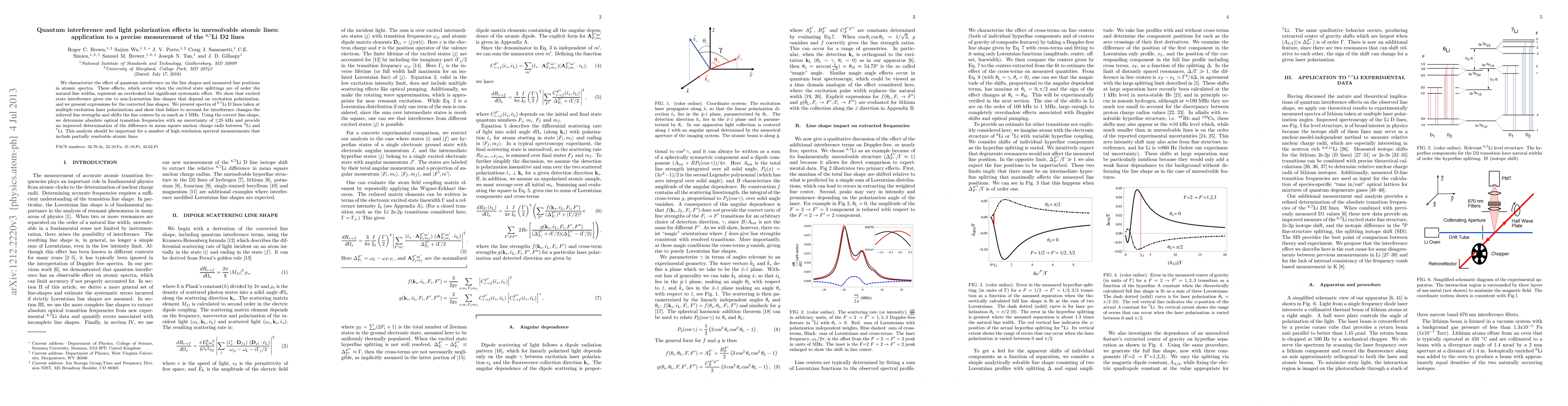 We characterize the effect of quantum interference on the line shapes and measured line positions in atomic spectra. These effects, which occur when the excited state splittings are of order the excited state line widths, represent an overlooked but significant systematic effect. We show that excited state interference gives rise to non-Lorenztian line shapes that depend on excitation polarization, and we present expressions for the corrected line shapes. We present spectra of 6,7 Li D lines taken at multiple excitation laser polarizations and show that failure to account for interference changes the inferred line strengths and shifts the line centers by as much as 1 MHz. Using the correct lineshape, we determine absolute optical transition frequencies with an uncertainty of <= 25kHz and provide an improved determination of the difference in mean square nuclear charge radii between 6 Li and 7 Li. This analysis should be important for a number of high resolution spectral measurements that include partially resolvable atomic lines.