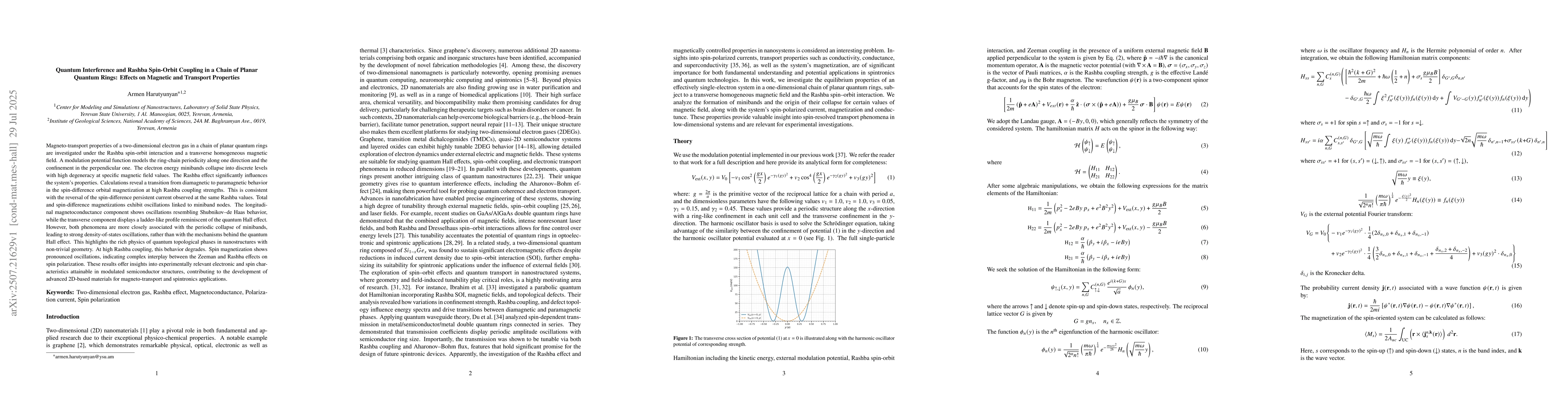 The research investigates the magneto-transport properties of a 2D electron gas in a chain of planar quantum rings under Rashba spin-orbit interaction and a transverse magnetic field using a modulation potential function to model periodicity and confinement.