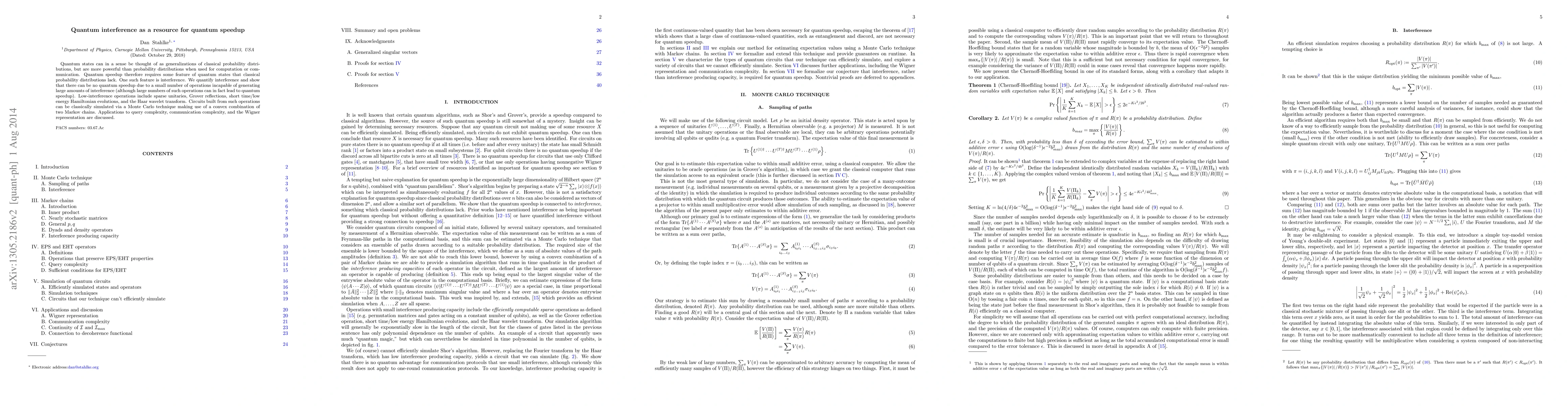 Quantum states can in a sense be thought of as generalizations of classical probability distributions, but are more powerful than probability distributions when used for computation or communication. Quantum speedup therefore requires some feature of quantum states that classical probability distributions lack. One such feature is interference. We quantify interference and show that there can be no quantum speedup due to a small number of operations incapable of generating large amounts of interference (although large numbers of such operations can in fact lead to quantum speedup). Low-interference operations include sparse unitaries, Grover reflections, short time/low energy Hamiltonian evolutions, and the Haar wavelet transform. Circuits built from such operations can be classically simulated via a Monte Carlo technique making use of a convex combination of two Markov chains. Applications to query complexity, communication complexity, and the Wigner representation are discussed.