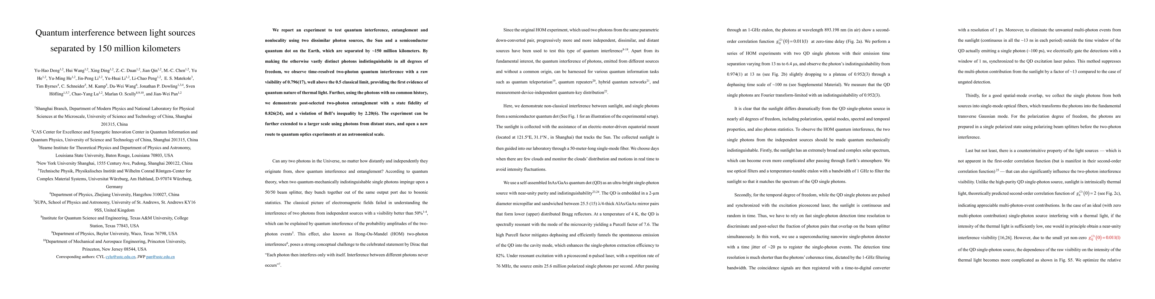 We report an experiment to test quantum interference, entanglement and nonlocality using two dissimilar photon sources, the Sun and a semiconductor quantum dot on the Earth, which are separated by 150 million kilometers. By making the otherwise vastly distinct photons indistinguishable all degrees of freedom, we observe time-resolved two-photon quantum interference with a raw visibility of 0.796(17), well above the 0.5 classical limit, providing the first evidence of quantum nature of thermal light. Further, using the photons with no common history, we demonstrate post-selected two-photon entanglement with a state fidelity of 0.826(24), and a violation of Bell's inequality by 2.20(6). The experiment can be further extended to a larger scale using photons from distant stars, and open a new route to quantum optics experiments at an astronomical scale.