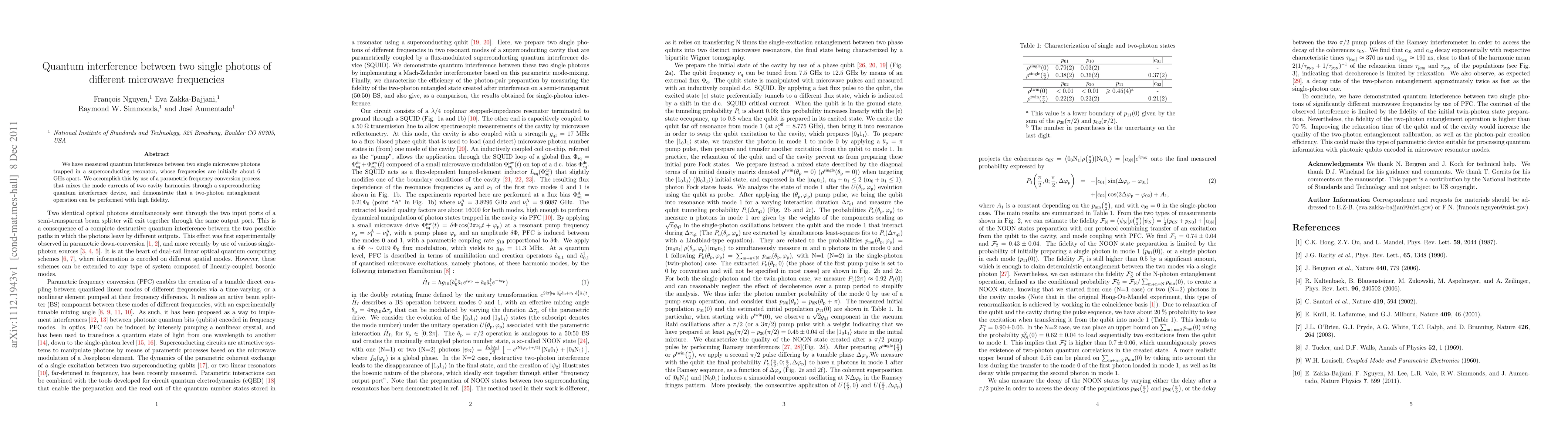 This study measures quantum interference between two single microwave photons of different frequencies using a parametric frequency conversion process in a superconducting resonator, achieving high fidelity two-photon entanglement.