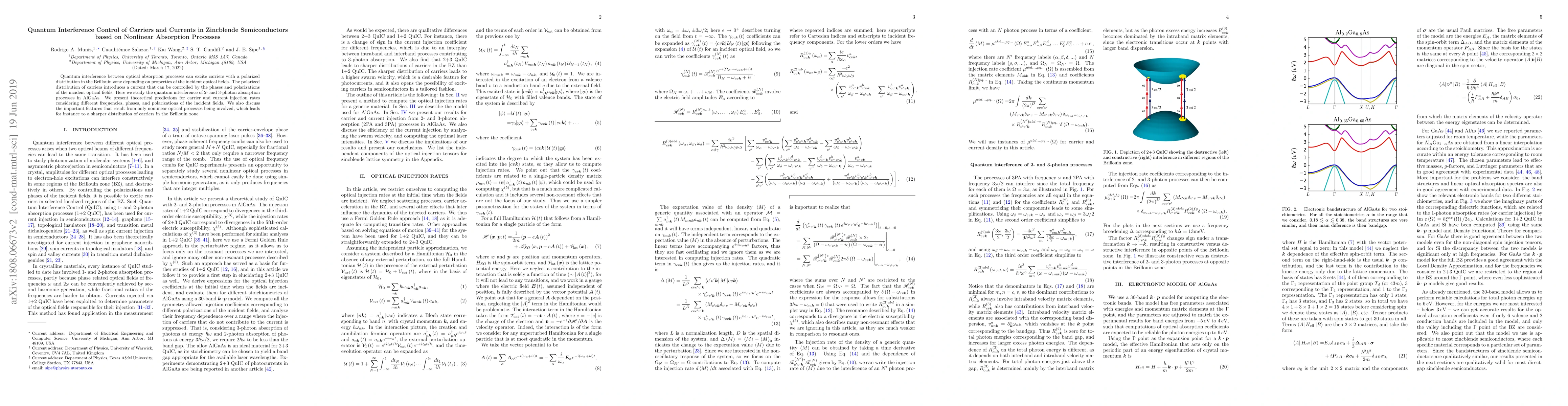 This paper explores quantum interference in nonlinear absorption processes in AlGaAs semiconductors, showing how it can excite carriers with a polarized distribution, leading to controllable currents based on the phases and polarizations of incident optical fields. Theoretical predictions detail carrier and current injection rates under varying optical field conditions.