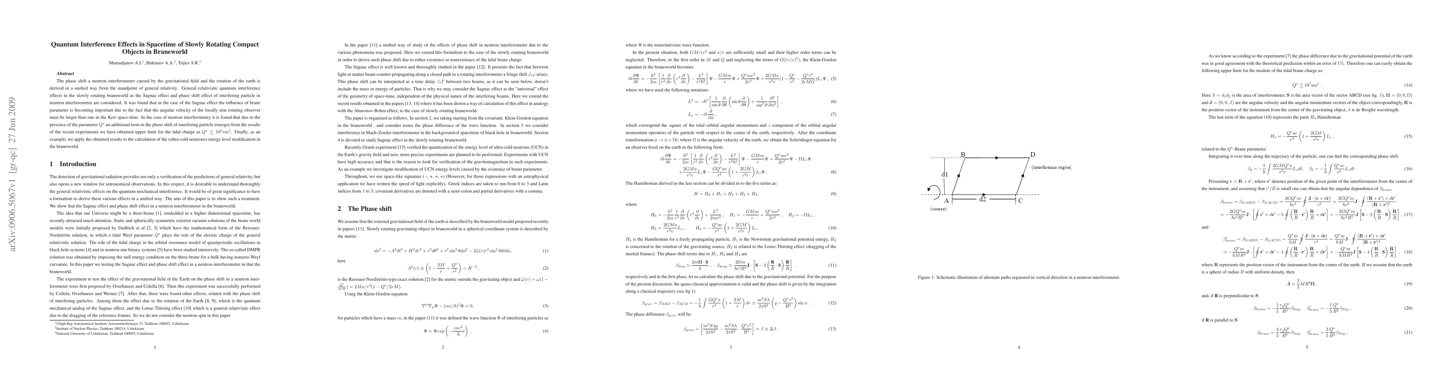The phase shift a neutron interferometer caused by the gravitational field and the rotation of the earth is derived in a unified way from the standpoint of general relativity. General relativistic quantum interference effects in the slowly rotating braneworld as the Sagnac effect and phase shift effect of interfering particle in neutron interferometer are considered. It was found that in the case of the Sagnac effect the influence of brane parameter is becoming important due to the fact that the angular velocity of the locally non rotating observer must be larger than one in the Kerr space-time. In the case of neutron interferometry it is found that due to the presence of the parameter $Q^{*}$ an additional term in the phase shift of interfering particle emerges from the results of the recent experiments we have obtained upper limit for the tidal charge as $Q^{*}\lesssim 10^{7} \rm{cm}^{2}$. Finally, as an example, we apply the obtained results to the calculation of the (ultra-cold neutrons) energy level modification in the braneworld.