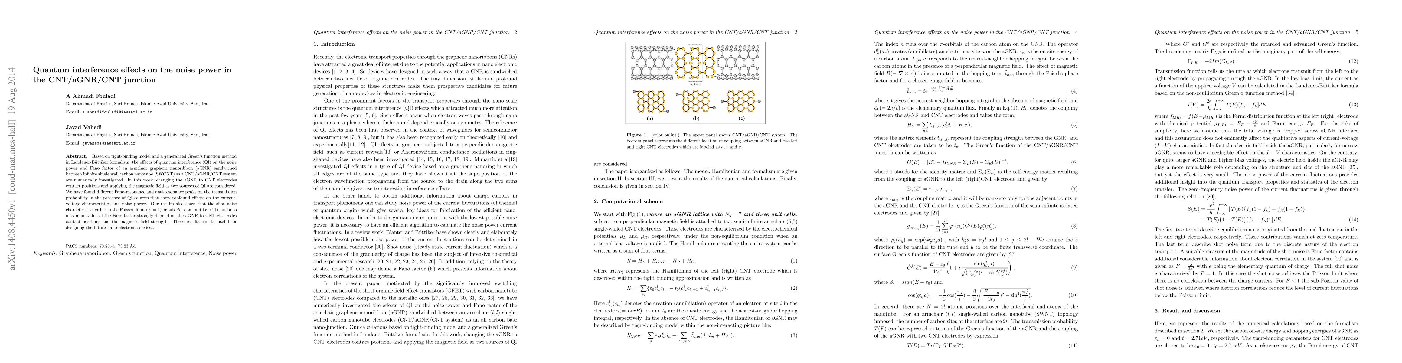 This study uses a tight-binding model and Green's function method to explore quantum interference effects on noise power in a CNT/aGNR/CNT system. Results indicate that transmission probability exhibits Fano-resonance and anti-resonance peaks due to quantum interference, significantly influencing current-voltage characteristics and noise power. The shot noise characteristics, Fano factor, and their maximum values are found to depend on aGNR-to-CNT electrode contact positions and magnetic field strength, offering insights for nano-electronic device design.