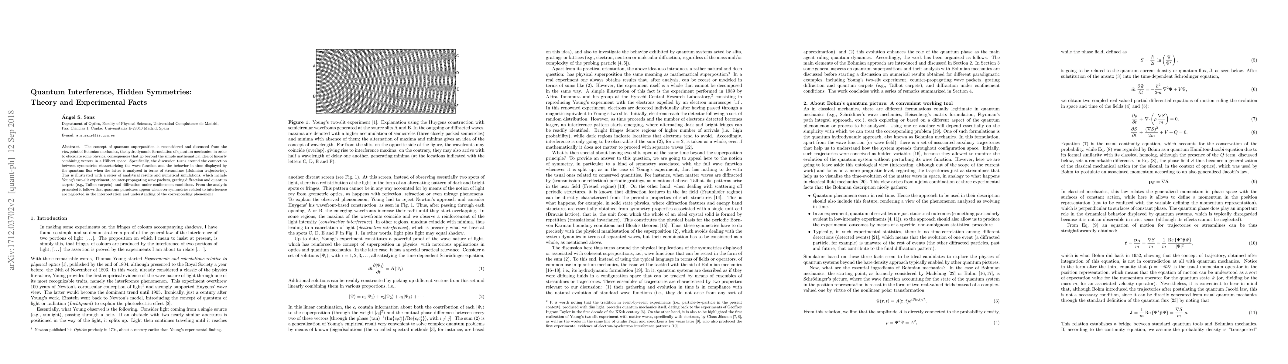 The concept of quantum superposition is reconsidered and discussed from the viewpoint of Bohmian mechanics, the hydrodynamic formulation of quantum mechanics, in order to elucidate some physical consequences that go beyond the simple mathematical idea of linearly combining vectors in a Hilbert space. Specifically, the discussion turns around the connection between symmetries characterizing the wave function and the behavior in time displayed by the quantum flux when the latter is analyzed in terms of streamlines (Bohmian trajectories). This is illustrated with a series of analytical results and numerical simulations, which include Young's two-slit experiment, counter-propagating wave packets, grating diffraction and quantum carpets (e.g., Talbot carpets), and diffraction under confinement conditions. From the analysis presented it follows that quantum paradoxes appear whenever symmetries related to interference are neglected in the interpretation and understanding of the corresponding phenomena.