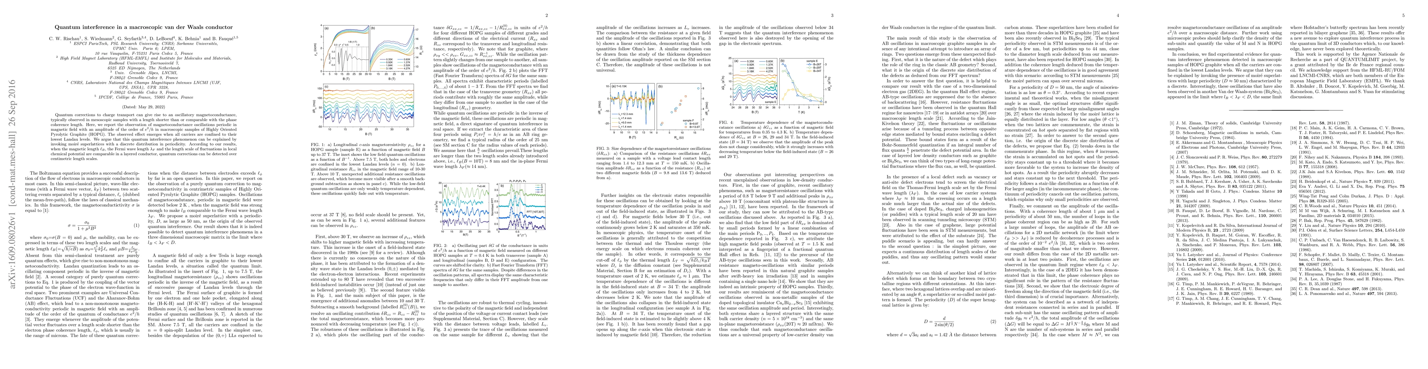 Quantum corrections to charge transport can give rise to an oscillatory magnetoconductance, typically observed in mesoscopic samples with a length shorter than or comparable with the phase coherence length. Here, we report the observation of magnetoconductance oscillations periodic in magnetic field with an amplitude of the order of $e^2/h$ in macroscopic samples of Highly Oriented Pyrolytic Graphite (HOPG). The observed effect emerges when all carriers are confined to their lowest Landau levels. We argue that this quantum interference phenomenon can be explained by invoking moir\'e superlattices with a discrete distribution in periodicity. According to our results, when the magnetic length $\ell_B$, the Fermi wave length $\lambda_F$ and the length scale of fluctuations in local chemical potential are comparable in a layered conductor, quantum corrections can be detected over centimetric length scales.