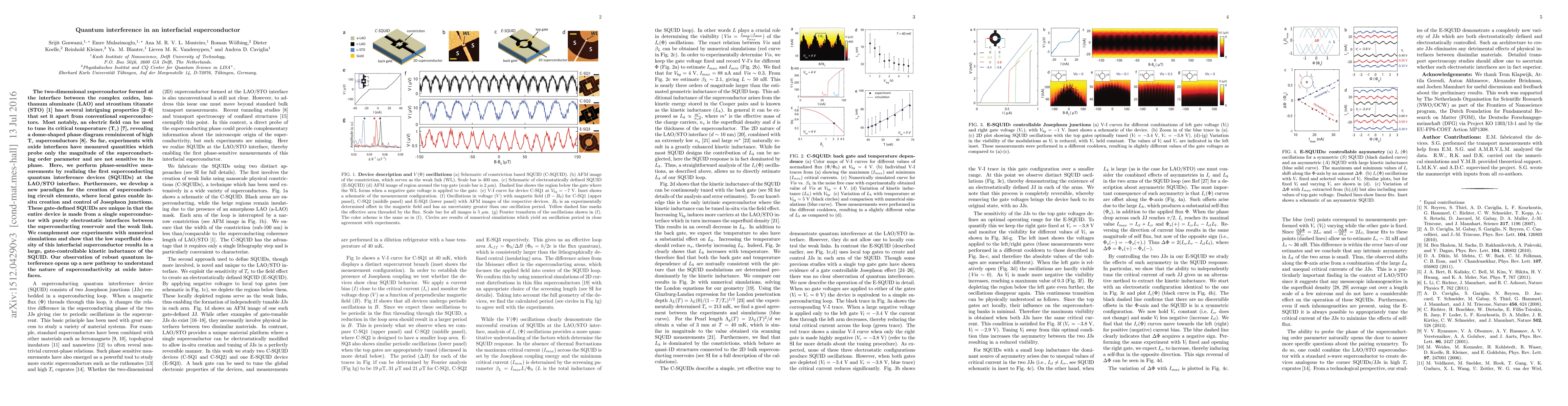 The two-dimensional superconductor formed at the interface between the complex oxides, lanthanum aluminate (LAO) and strontium titanate (STO) has several intriguing properties that set it apart from conventional superconductors. Most notably, an electric field can be used to tune its critical temperature (T$_c$), revealing a dome-shaped phase diagram reminiscent of high T$_c$ superconductors. So far, experiments with oxide interfaces have measured quantities which probe only the magnitude of the superconducting order parameter and are not sensitive to its phase. Here, we perform phase-sensitive measurements by realizing the first superconducting quantum interference devices (SQUIDs) at the LAO/STO interface. Furthermore, we develop a new paradigm for the creation of superconducting circuit elements, where local gates enable in-situ creation and control of Josephson junctions. These gate-defined SQUIDs are unique in that the entire device is made from a single superconductor with purely electrostatic interfaces between the superconducting reservoir and the weak link. We complement our experiments with numerical simulations and show that the low superfluid density of this interfacial superconductor results in a large, gate-controllable kinetic inductance of the SQUID. Our observation of robust quantum interference opens up a new pathway to understand the nature of superconductivity at oxide interfaces.