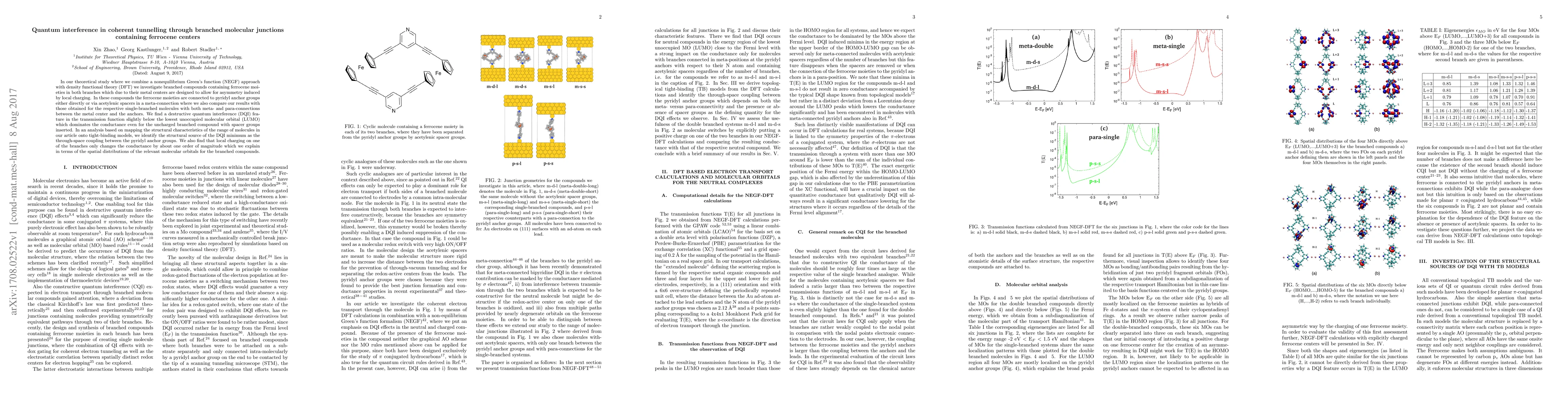 This study uses a combined NEGF and DFT approach to analyze branched molecular junctions with ferrocene centers. It reveals a dominant destructive quantum interference feature in transmission, caused by through-space coupling between pyridyl anchor groups. Local charging impacts conductance by roughly an order of magnitude.