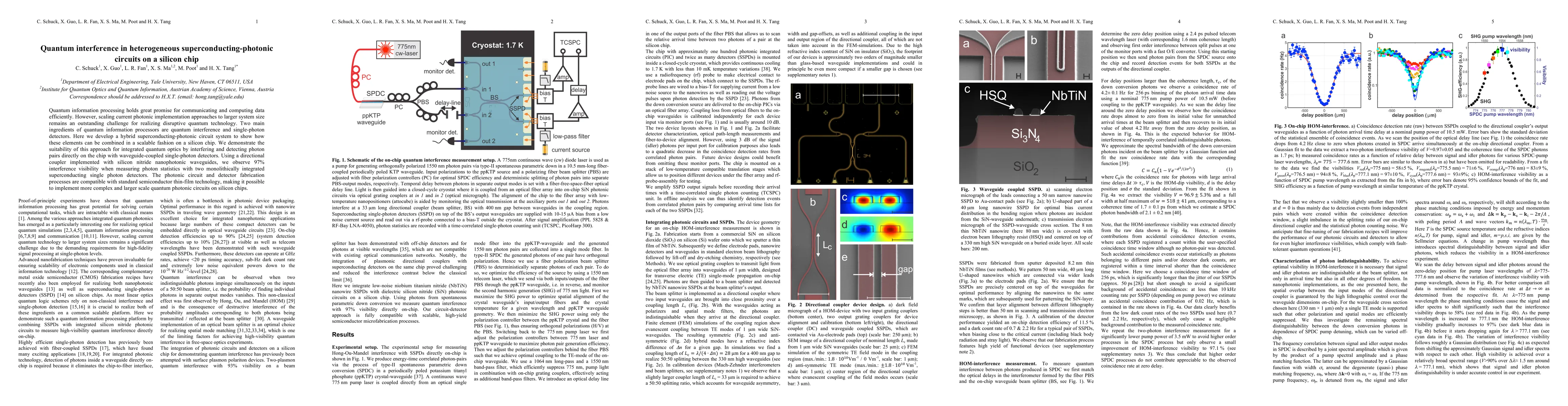 This paper develops a hybrid superconducting-photonic circuit on a silicon chip to demonstrate scalable quantum information processing, showing 97% interference visibility using waveguide-coupled single-photon detectors, and confirming compatibility with semiconductor technology for larger quantum photonic circuits.
