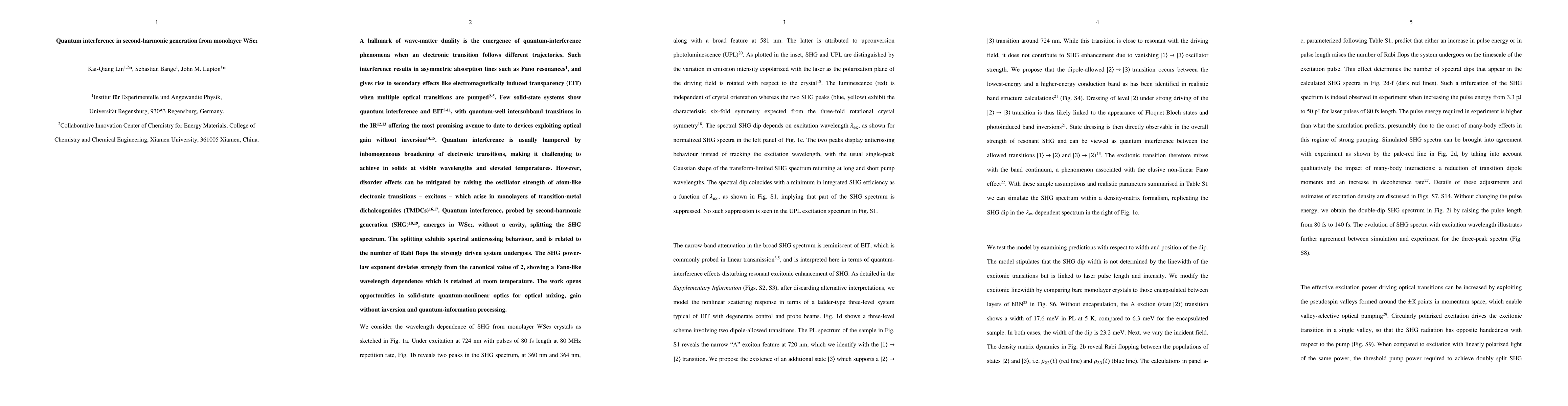 Research demonstrates quantum interference in second-harmonic generation from monolayer WSe2, showing asymmetric absorption lines and Fano resonances. The SHG spectrum splits and exhibits anticrossing behavior, indicating potential for optical mixing and quantum-information processing in solid-state quantum-nonlinear optics.