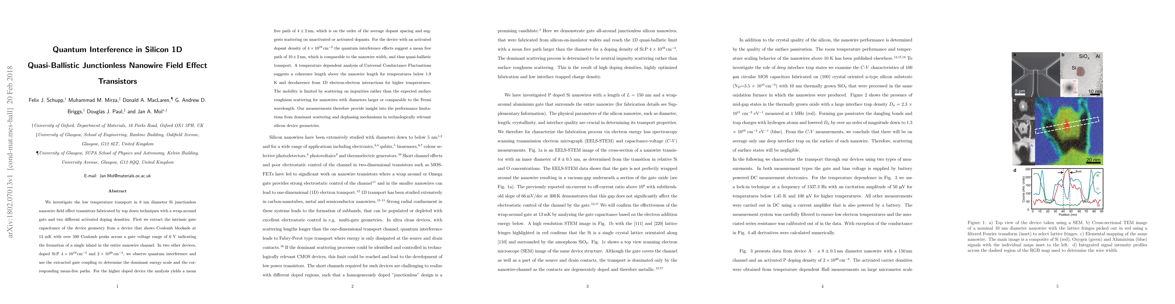 We investigate the low temperature transport in 8 nm diameter Si junctionless nanowire field effect transistors fabricated by top down techniques with a wrap-around gate and two different activated doping densities. First we extract the intrinsic gate capacitance of the device geometry from a device that shows Coulomb blockade at 13 mK with over 500 Coulomb peaks across a gate voltage range of 6 V indicating the formation of a single island in the entire nanowire channel. In two other devices, doped Si:P $4\times10^{19}\,\text{cm}^{-3}$ and $2\times10^{20}\,\text{cm}^{-3}$, we observe quantum interference and use the extracted gate coupling to determine the dominant energy scale and the corresponding mean-free paths. For the higher doped device the analysis yields a mean free path of $4\pm2\,\text{nm}$, which is on the order of the average dopant spacing and suggests scattering on unactivated or activated dopants. For the device with an activated dopant density of $4\times10^{19}\,\text{cm}^{-3}$ the quantum interference effects suggest a mean free path of $10\pm2\,\text{nm}$, which is comparable to the nanowire width, and thus quasi-ballistic transport. A temperature dependent analysis of Universal Conductance Fluctuations suggests a coherence length above the nanowire length for temperatures below 1.9 K and decoherence from 1D electron-electron interactions for higher temperatures. The mobility is limited by scattering on impurities rather than the expected surface roughness scattering for nanowires with diameters larger or comparable to the Fermi wavelength. Our measurements therefore provide insight into the performance limitations from dominant scattering and dephasing mechanisms in technologically relevant silicon device geometries.