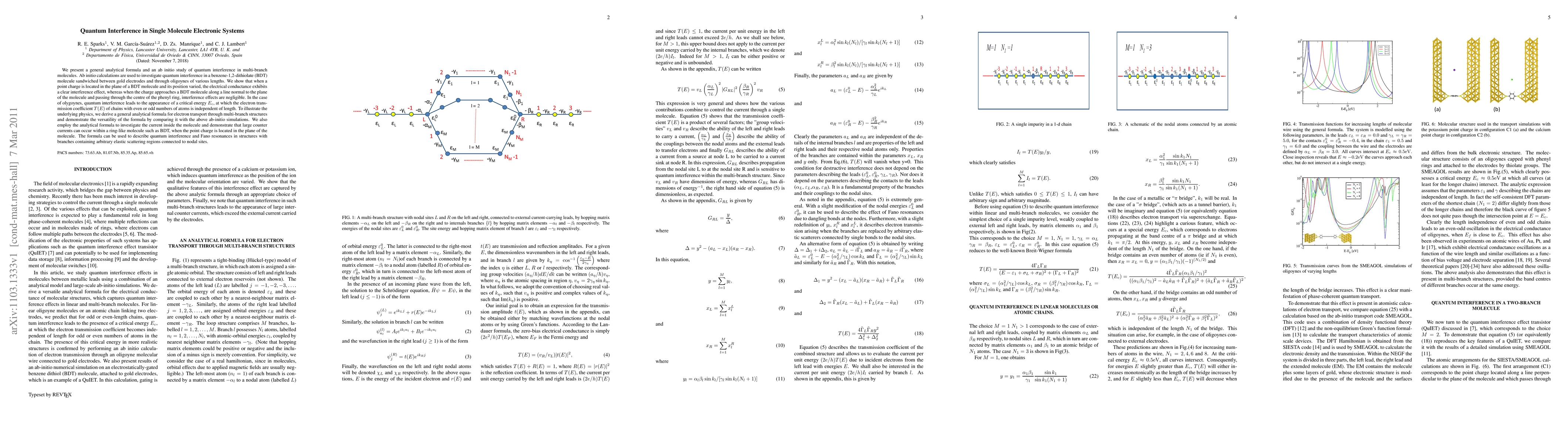 We present a general analytical formula and an ab initio study of quantum interference in multi-branch molecules. Ab initio calculations are used to investigate quantum interference in a benzene-1,2-dithiolate (BDT) molecule sandwiched between gold electrodes and through oligoynes of various lengths. We show that when a point charge is located in the plane of a BDT molecule and its position varied, the electrical conductance exhibits a clear interference effect, whereas when the charge approaches a BDT molecule along a line normal to the plane of the molecule and passing through the centre of the phenyl ring, interference effects are negligible. In the case of olygoynes, quantum interference leads to the appearance of a critical energy $E_c$, at which the electron transmission coefficient $T(E)$ of chains with even or odd numbers of atoms is independent of length. To illustrate the underlying physics, we derive a general analytical formula for electron transport through multi-branch structures and demonstrate the versatility of the formula by comparing it with the above ab-initio simulations. We also employ the analytical formula to investigate the current inside the molecule and demonstrate that large counter currents can occur within a ring-like molecule such as BDT, when the point charge is located in the plane of the molecule. The formula can be used to describe quantum interference and Fano resonances in structures with branches containing arbitrary elastic scattering regions connected to nodal sites.