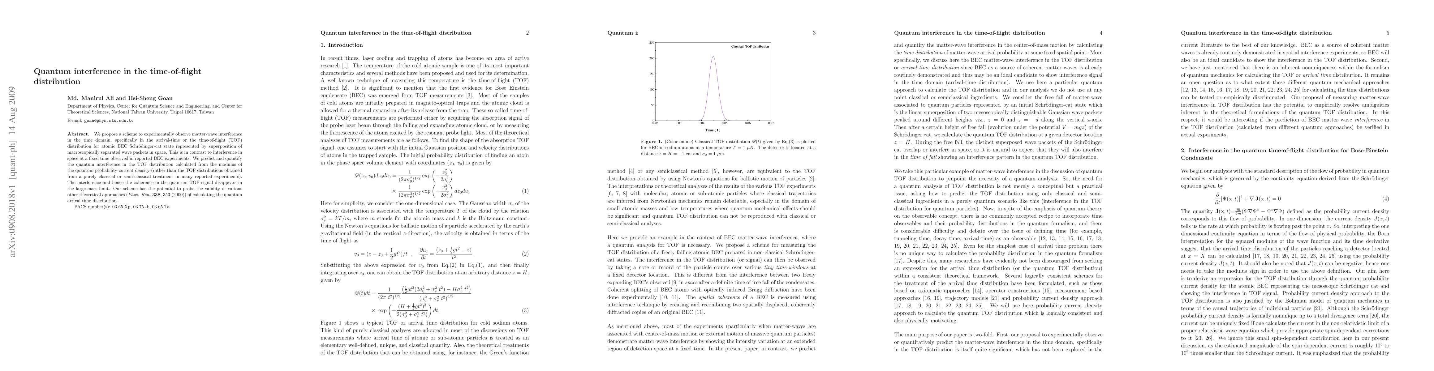 This paper proposes a method to observe quantum interference in the time-of-flight distribution of a Bose-Einstein condensate, contrasting with traditional spatial interference observations. The study predicts quantum interference effects in the arrival time distribution, which vanish in the large-mass limit, and aims to test various theoretical models for quantum arrival time distributions.