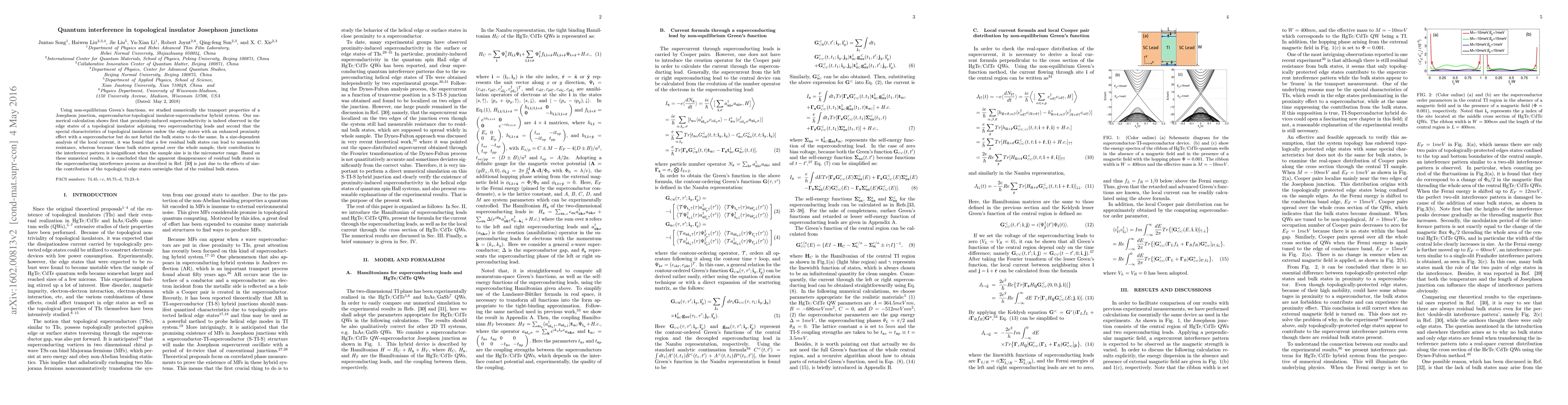 Using non-equilibrium Green's functions, we studied numerically the transport properties of a Josephson junction, superconductor-topological insulator-superconductor hybrid system. Our numerical calculation shows first that proximity-induced superconductivity is indeed observed in the edge states of a topological insulator adjoining two superconducting leads and second that the special characteristics of topological insulators endow the edge states with an enhanced proximity effect with a superconductor but do not forbid the bulk states to do the same. In a size-dependent analysis of the local current, it was found that a few residual bulk states can lead to measurable resistance, whereas because these bulk states spread over the whole sample, their contribution to the interference pattern is insignificant when the sample size is in the micrometer range. Based on these numerical results, it is concluded that the apparent disappearance of residual bulk states in the superconducting interference process as described in Ref. [\onlinecite{HartNautrePhys2014f}] is just due to the effects of size: the contribution of the topological edge states outweighs that of the residual bulk states.