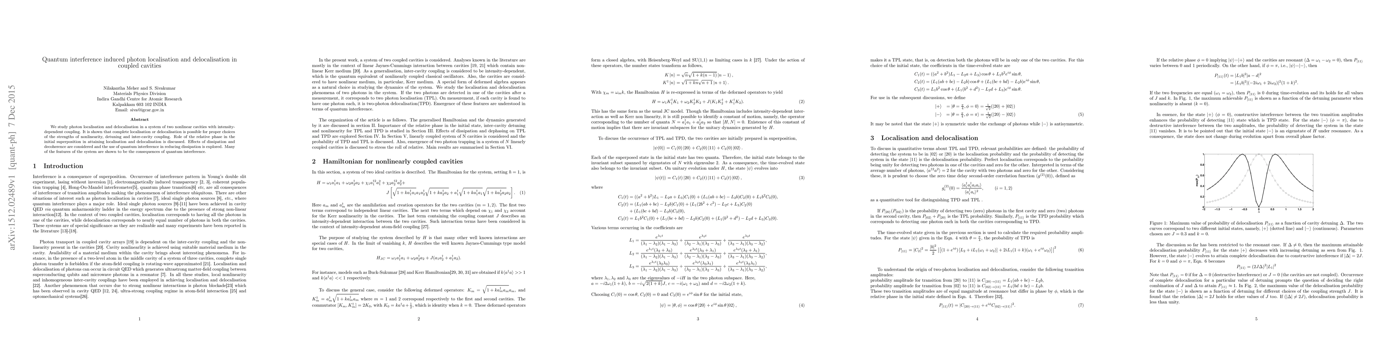 We study photon localisation and delocalisation in a system of two nonlinear cavities with intensity-dependent coupling. It is shown that complete localisation or delocalisation is possible for proper choices of the strengths of nonlinearity, detuning and inter-cavity coupling. Role of the relative phase in the initial superposition in attaining localisation and delocalisation is discussed. Effects of dissipation and decoherence are considered and the use of quantum interference in reducing dissipation is explored. Many of the features of the system are shown to be the consequences of quantum interference.