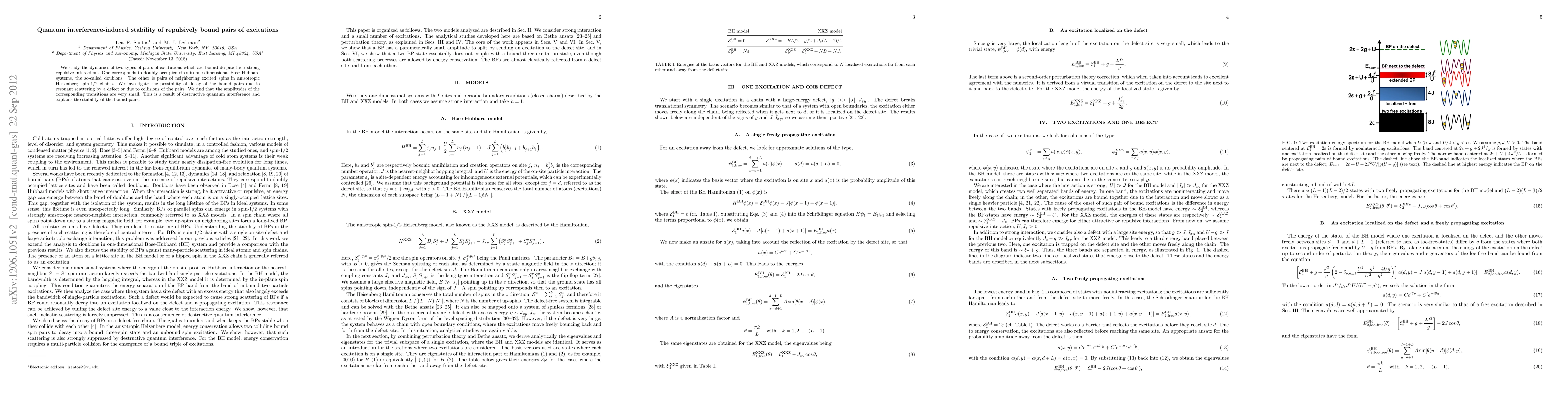 This paper investigates the stability of repulsively bound pairs of excitations in one-dimensional Bose-Hubbard systems and anisotropic Heisenberg spin-1/2 chains, finding that quantum interference significantly reduces decay rates, thereby maintaining pair stability.