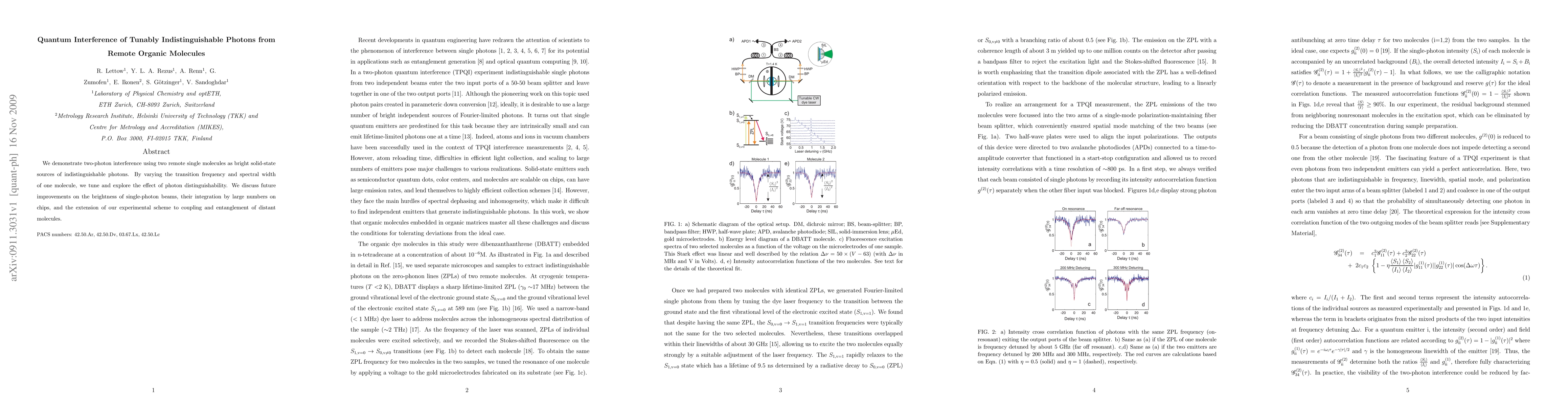 This paper demonstrates two-photon interference from remote organic molecules, showing how tuning the transition frequency and spectral width of one molecule affects photon distinguishability. Future work aims to enhance single-photon beam brightness and integrate multiple sources on chips, with potential for extending the scheme to molecule entanglement.