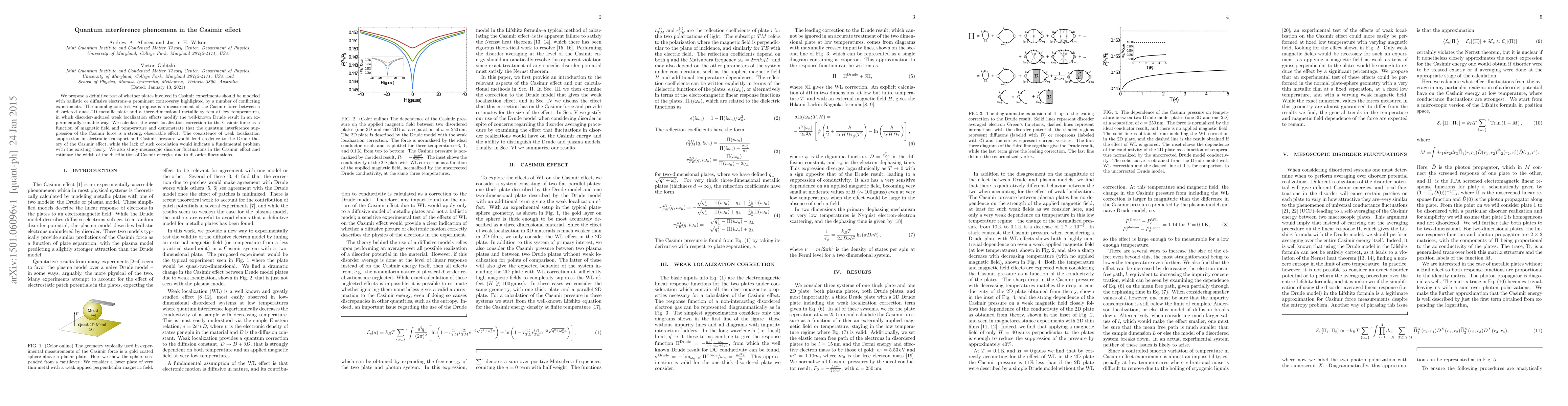 This research proposes a test to determine whether Casimir plates should be modeled with ballistic or diffusive electrons by measuring the Casimir force between a disordered quasi-2D metallic plate and a 3D metallic system at low temperatures. The study predicts a strong, observable quantum interference suppression of the Casimir force, which would support the Drude theory if observed, or indicate a fundamental issue if not.