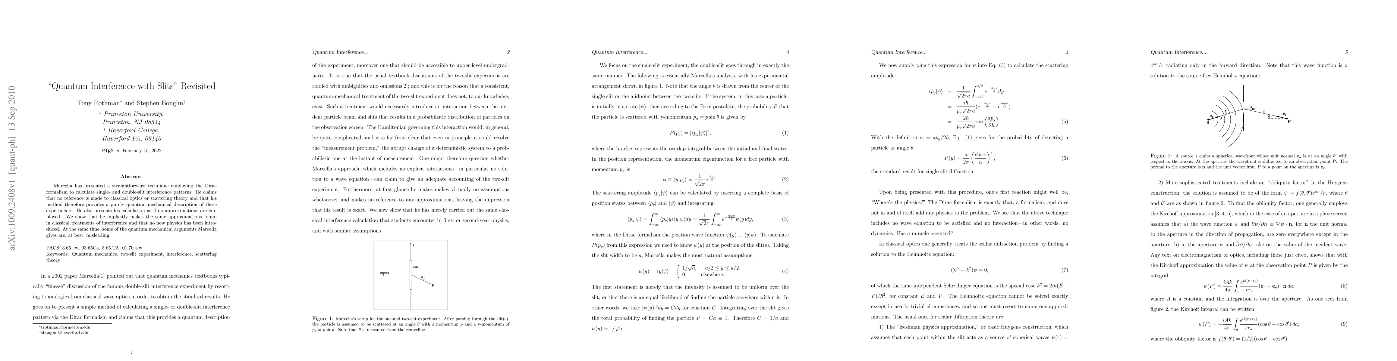 Marcella [arXiv:quant-ph/0703126] has presented a straightforward technique employing the Dirac formalism to calculate single- and double-slit interference patterns. He claims that no reference is made to classical optics or scattering theory and that his method therefore provides a purely quantum mechanical description of these experiments. He also presents his calculation as if no approximations are employed. We show that he implicitly makes the same approximations found in classical treatments of interference and that no new physics has been introduced. At the same time, some of the quantum mechanical arguments Marcella gives are, at best, misleading.