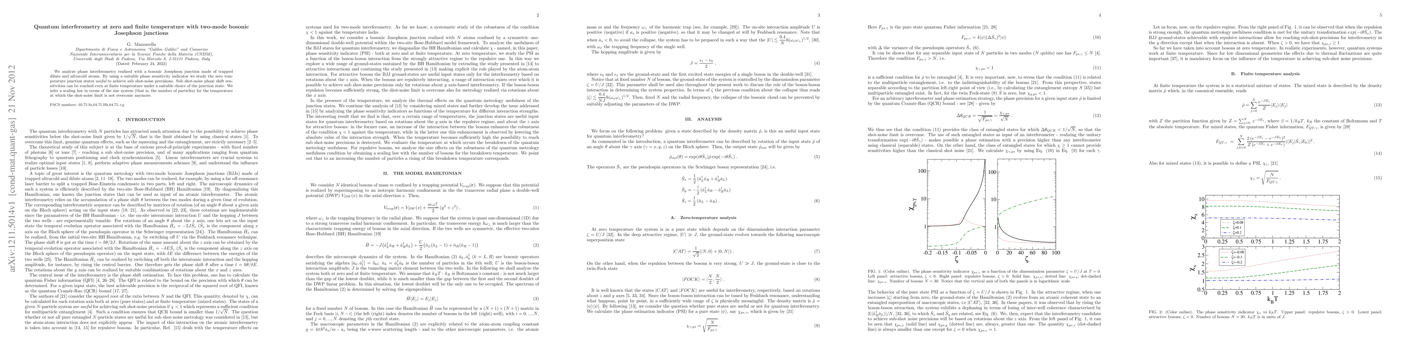 This paper explores quantum interferometry in bosonic Josephson junctions composed of ultracold atoms, achieving sub shot-noise precision at zero temperature. It also demonstrates that sub shot-noise phase shift sensitivities can be maintained at finite temperatures, revealing a scaling law dependent on the system's size.