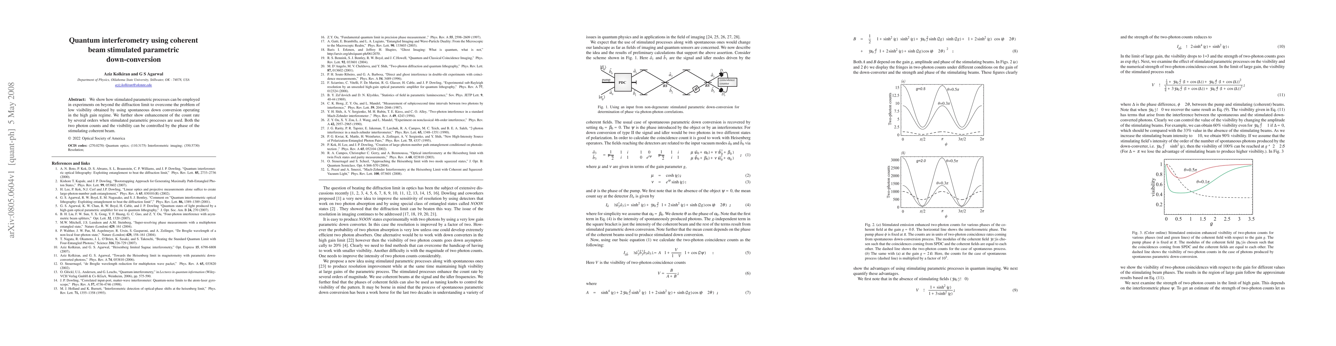 This paper demonstrates the use of stimulated parametric processes in quantum interferometry to achieve beyond-diffraction-limit imaging, overcoming low visibility issues from spontaneous down-conversion. It shows significant enhancement in count rate and control over two-photon counts and visibility through the phase of the stimulating coherent beam.